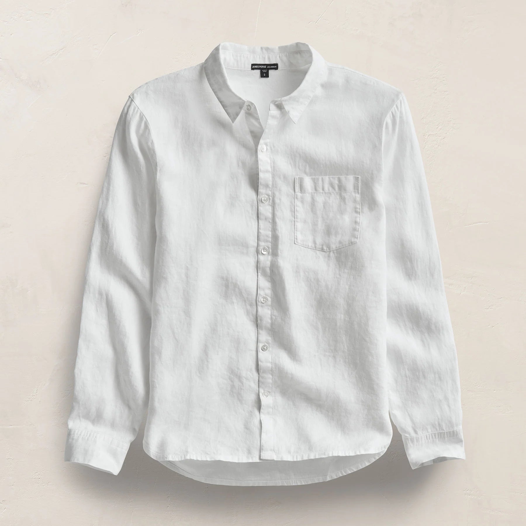 The Lightweight Linen Shirt in White is crafted from 100% linen, using a classic Italian lightweight linen that is both breathable and soft. This shirt features a relaxed fit, a full-length button-front closure, a single front chest pocket, full-length sleeves with plackets at the cuffs, a back yoke, and a shirt tail hem.