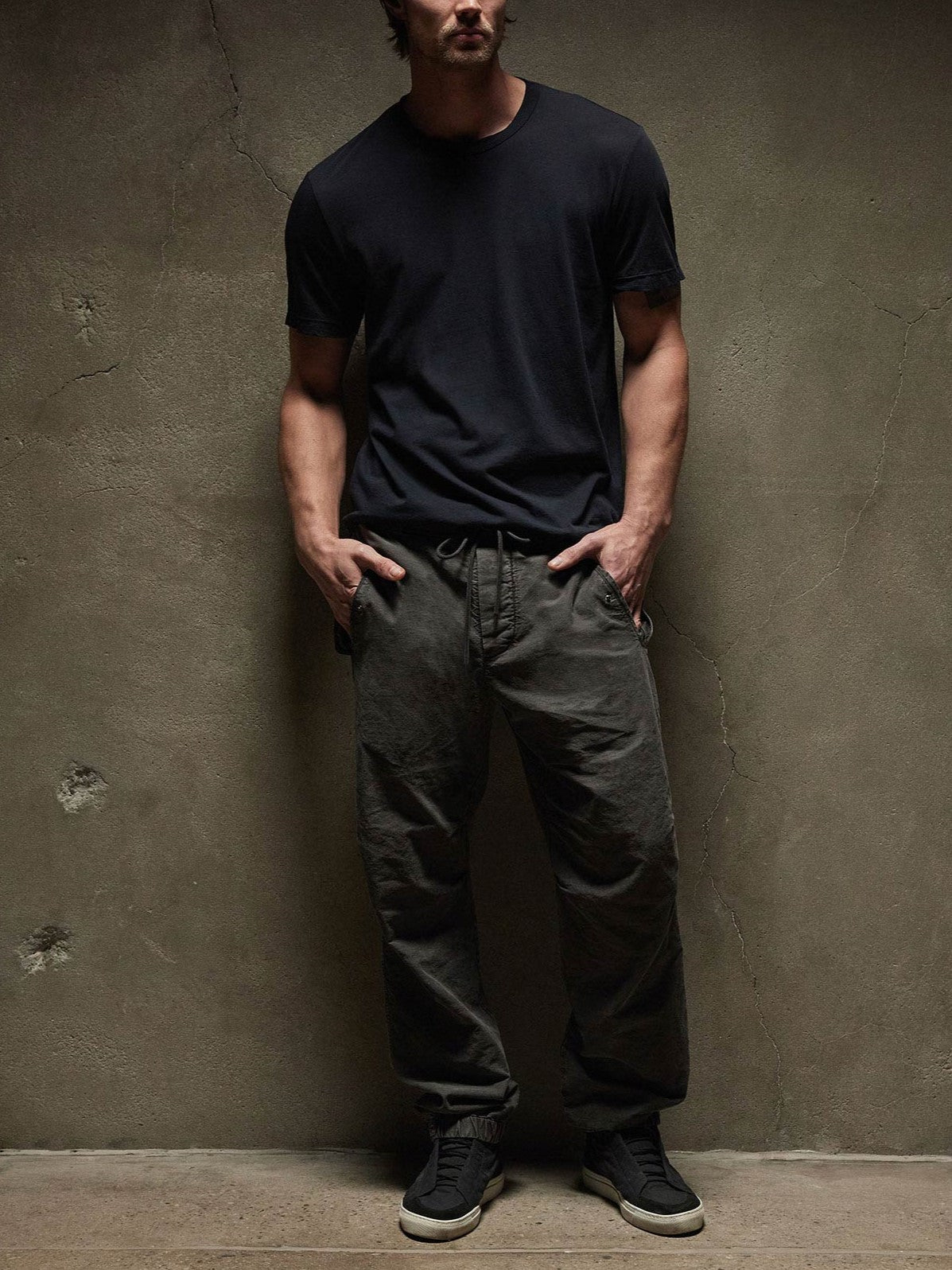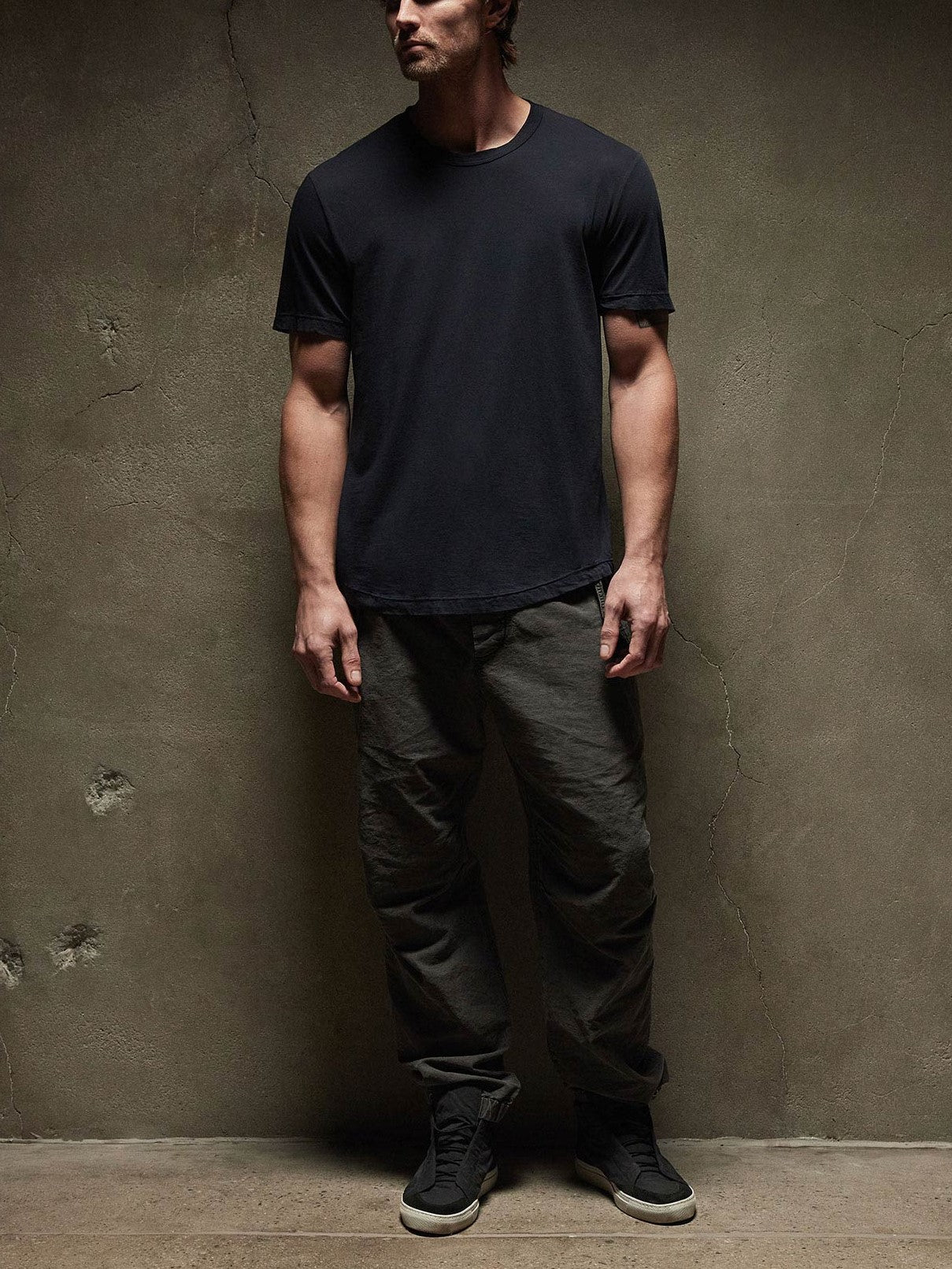 The James Perse Clear Jersey Crew in Deep Pigment is an easy-fit t-shirt made from 100% Supima Cotton that is spun and knit in Japan and constructed in the USA. The garment features a binded neck, short sleeves, clean-finished hems, and a slightly rounded bottom hem. It is garment-dyed using a special pigment process, which gives each shirt a unique look that is designed to evolve and fade over time, contributing to a soft, lived-in feel.