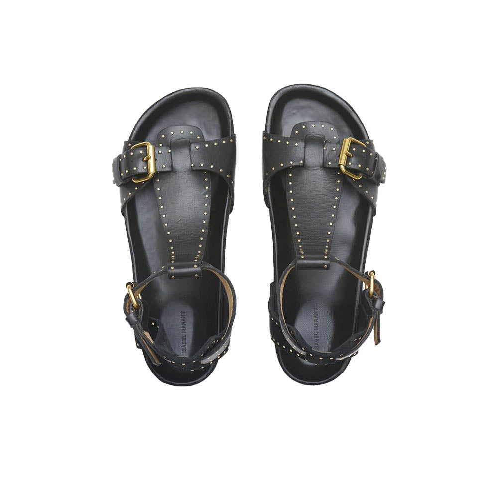 Layne Sandals from Isabel Marant is black cow leather studded flat sandals. It has buckle-fastening back strap.