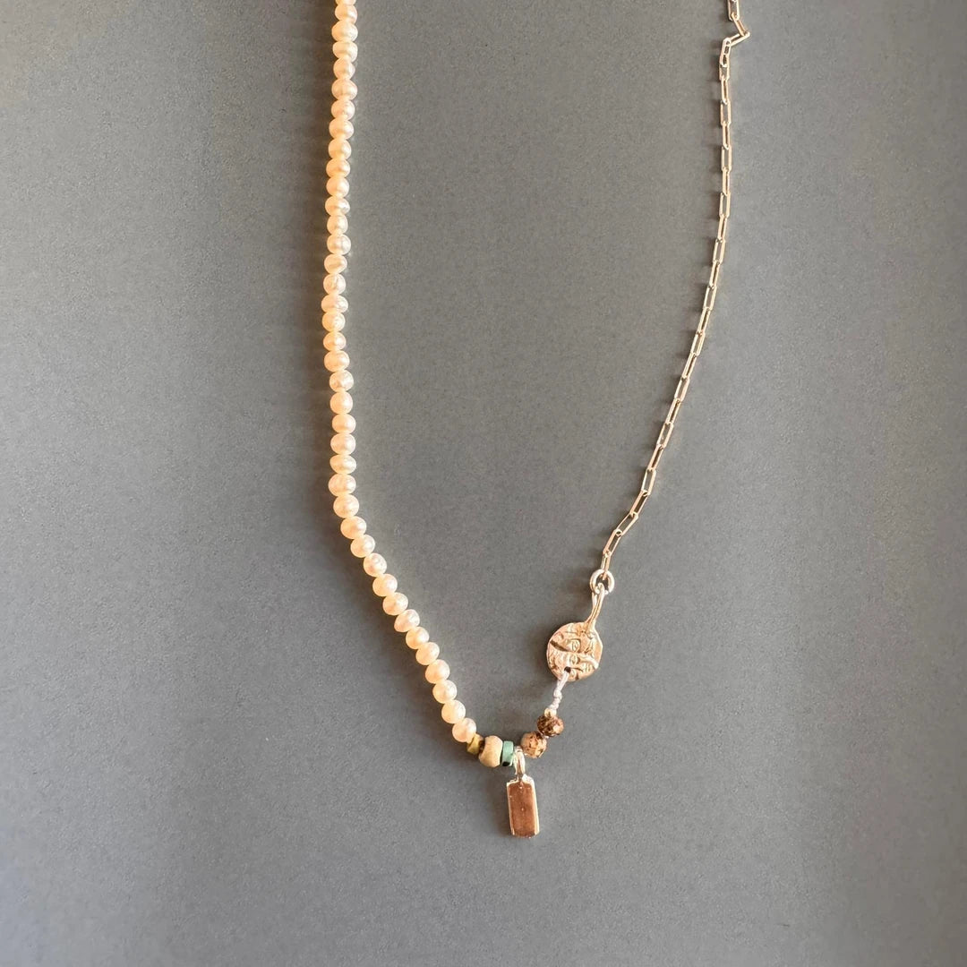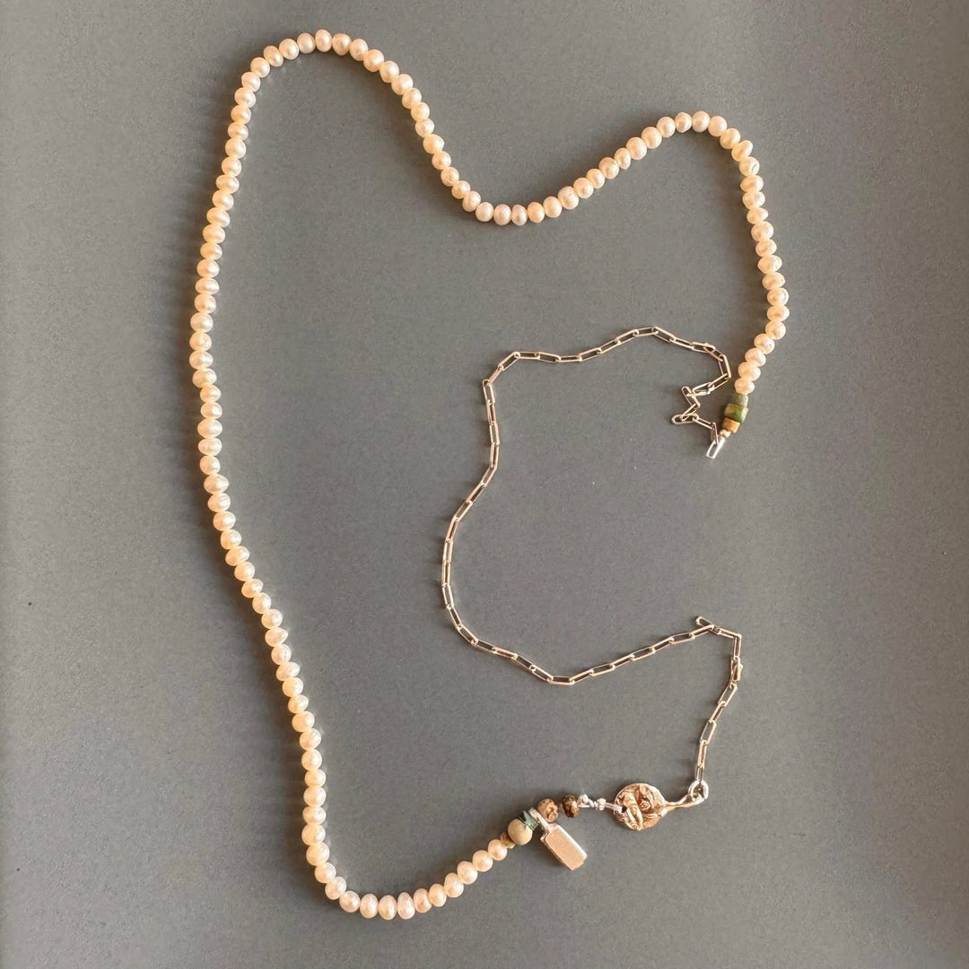 This necklace feature a unique combination of 925 sterling silver, pearl, turquoise, and jasper. It has a length of 60cm. This product is made from natural stones, expect variations in shapes and color.