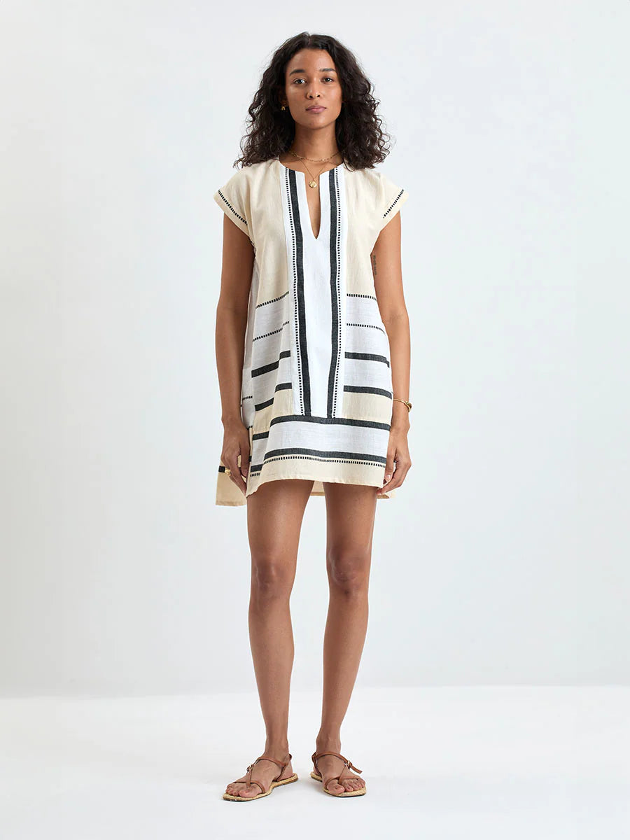 The lemlem Elina Caftan in Tomoca Cream is a short, versatile cover-up dress featuring a loose, true-to-size A-line silhouette, complete with a slit V-neckline and short sleeves. Hand-woven in Ethiopia from a blend of 85% Cotton and 15% Acrylic for a light and comfortable feel, the caftan showcases the Tomoca Cream Collection's refined palette of crisp white, soft cream, and deep black, incorporating bold stripes and dotted accents for a modern yet timeless look. Style details include decorative tibeb weaving and ruching at the side panels for added volume