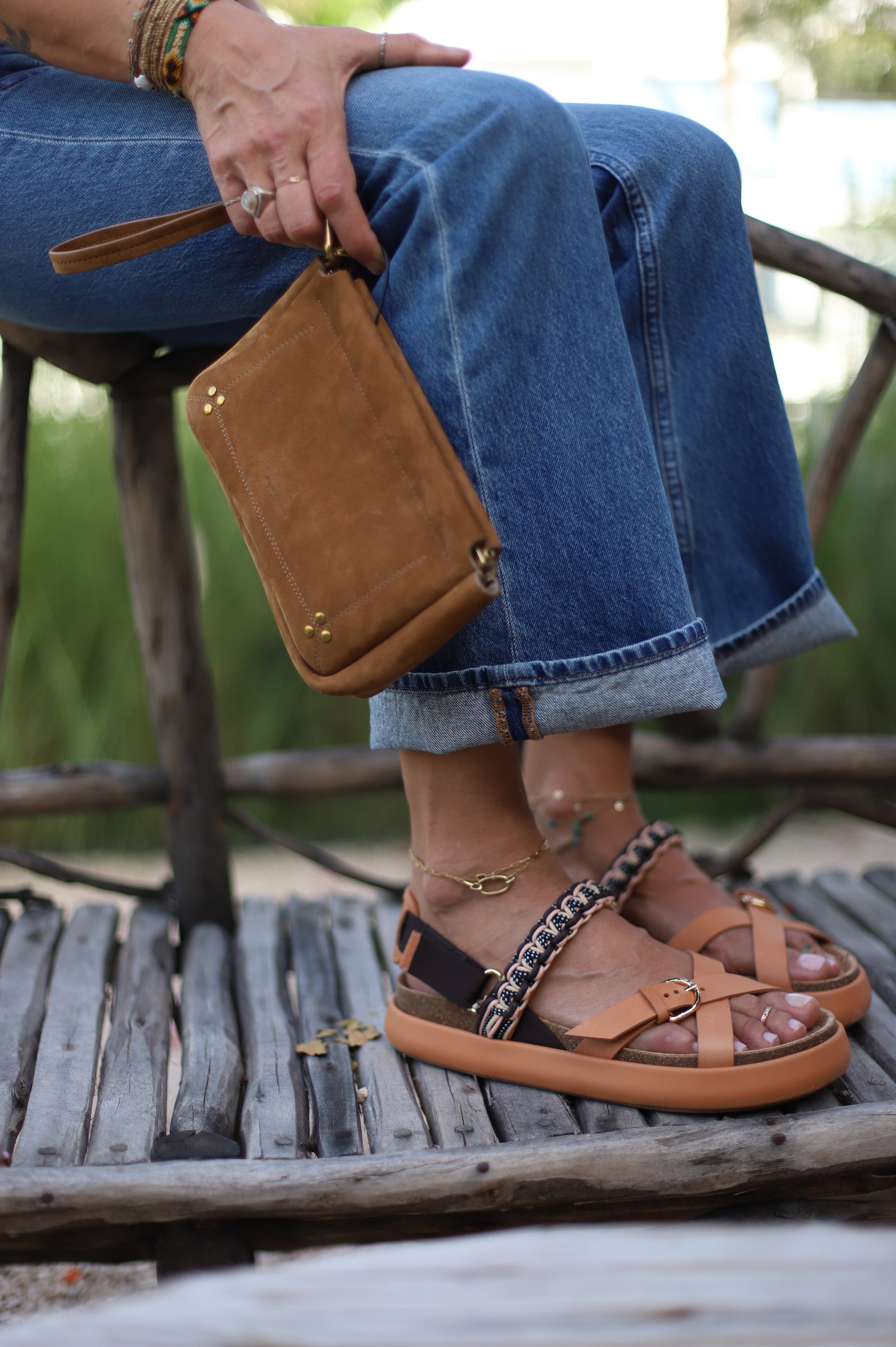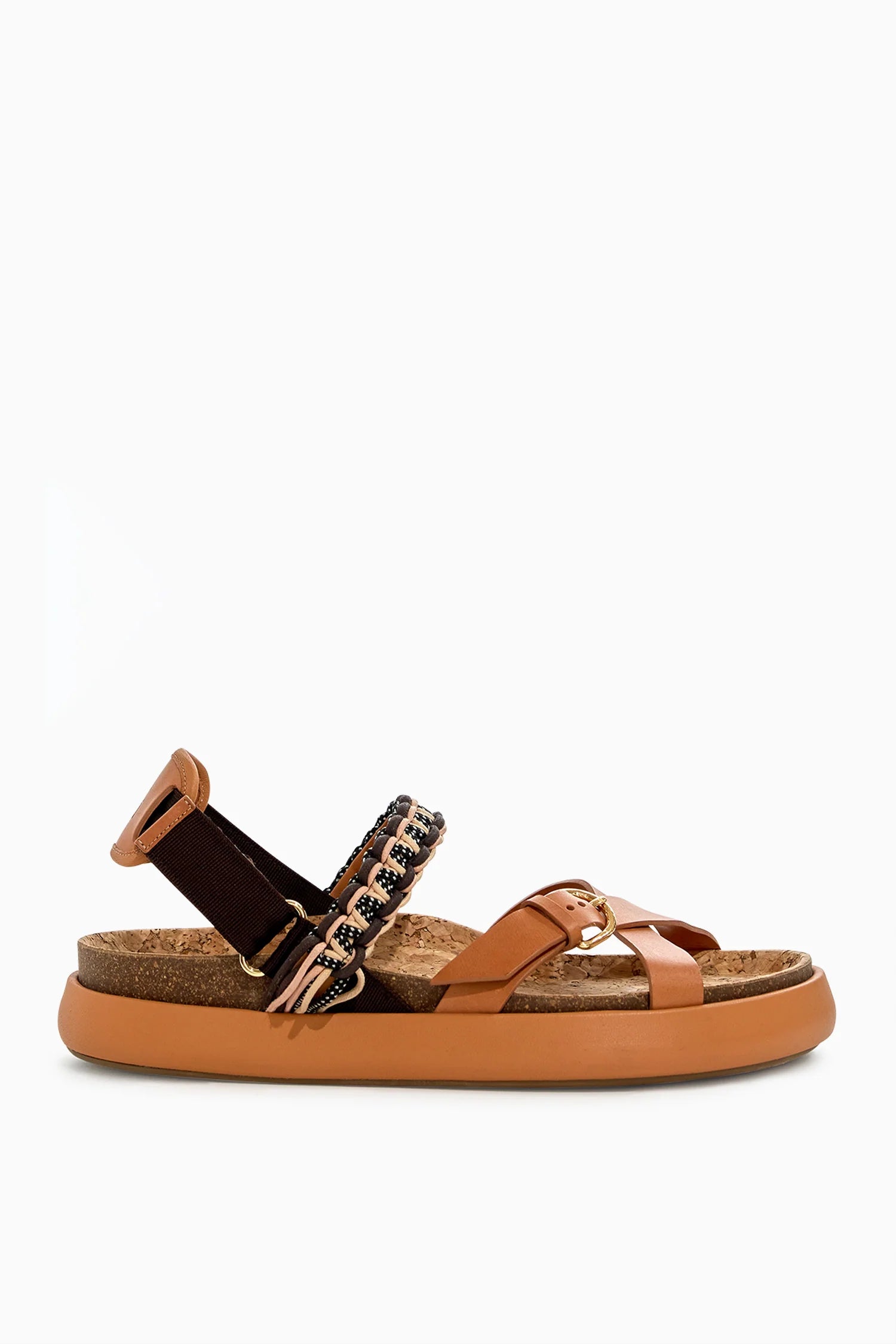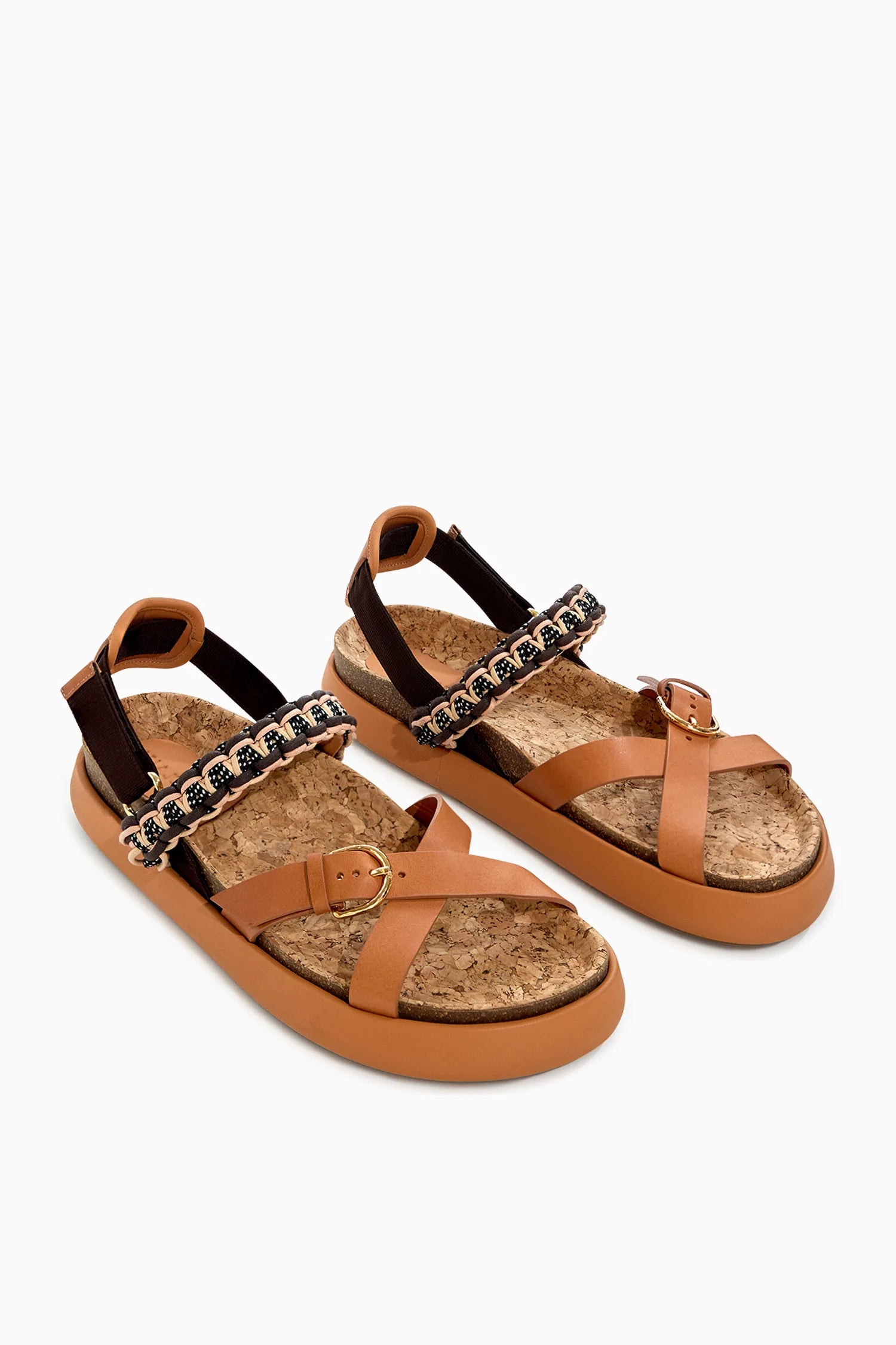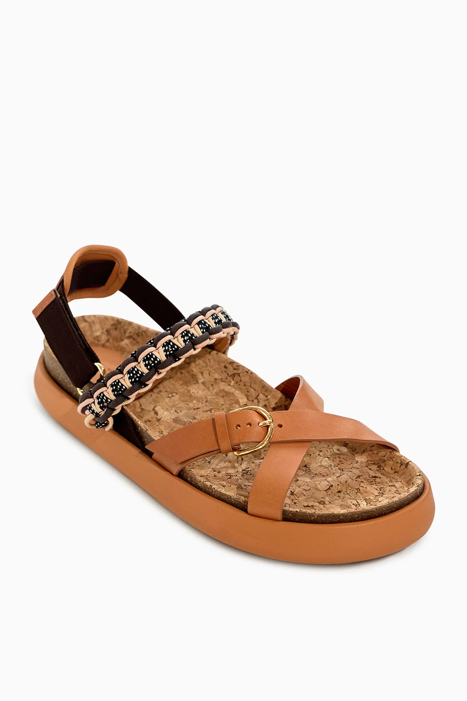 The Lilou sandal from Ulla Johnson is crafted with smooth brown leather and adorned with multi-hued macrame detailing. The molded cork footbed provides support, while the slingback strap is adjustable for added comfort.
