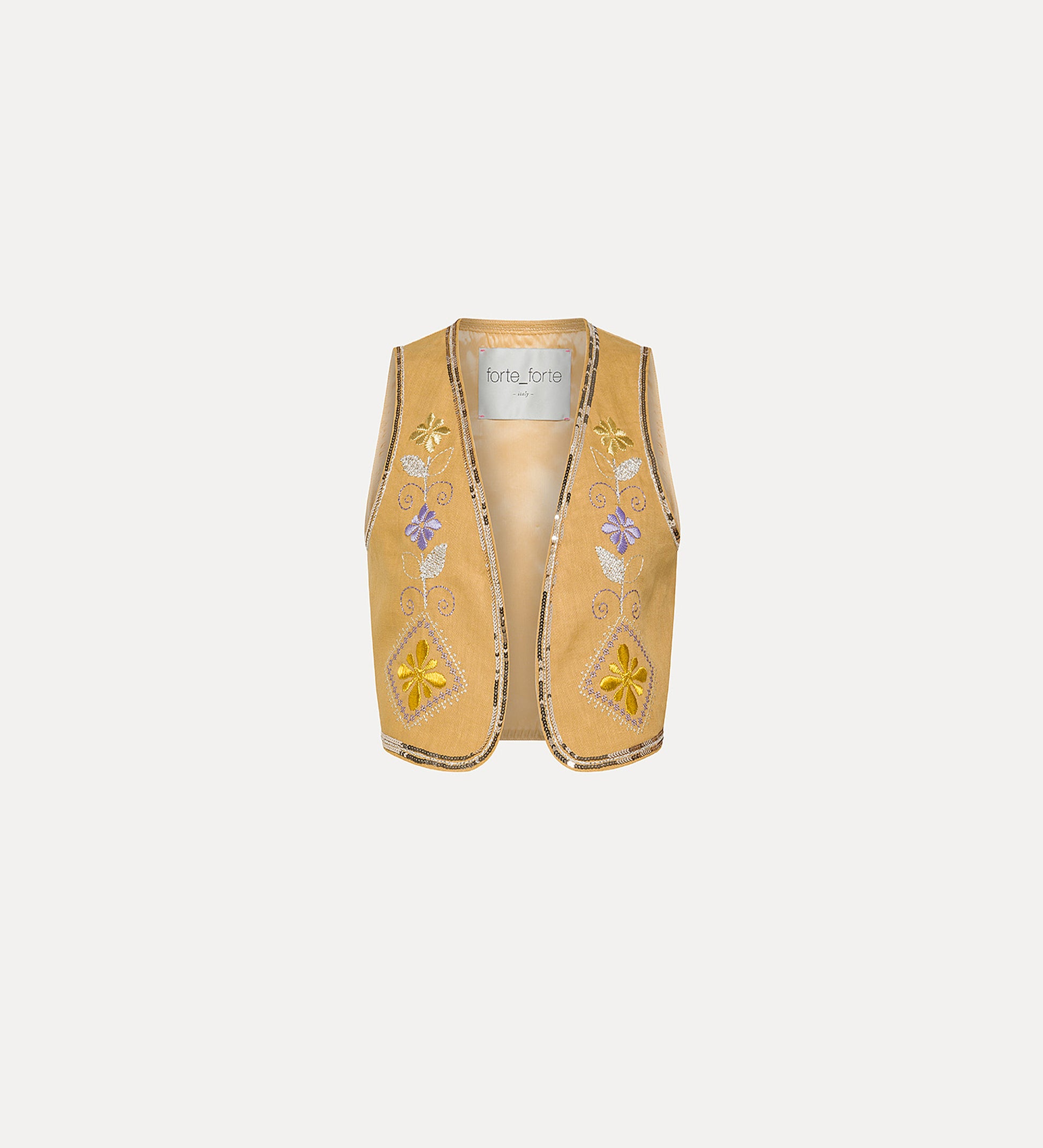 Light and refined, this cropped linen vest features subtle floral appliqué in beads and sequins. Open-front and effortlessly styled, it pairs beautifully with sheer blouses or worn alone for a minimalist statement.