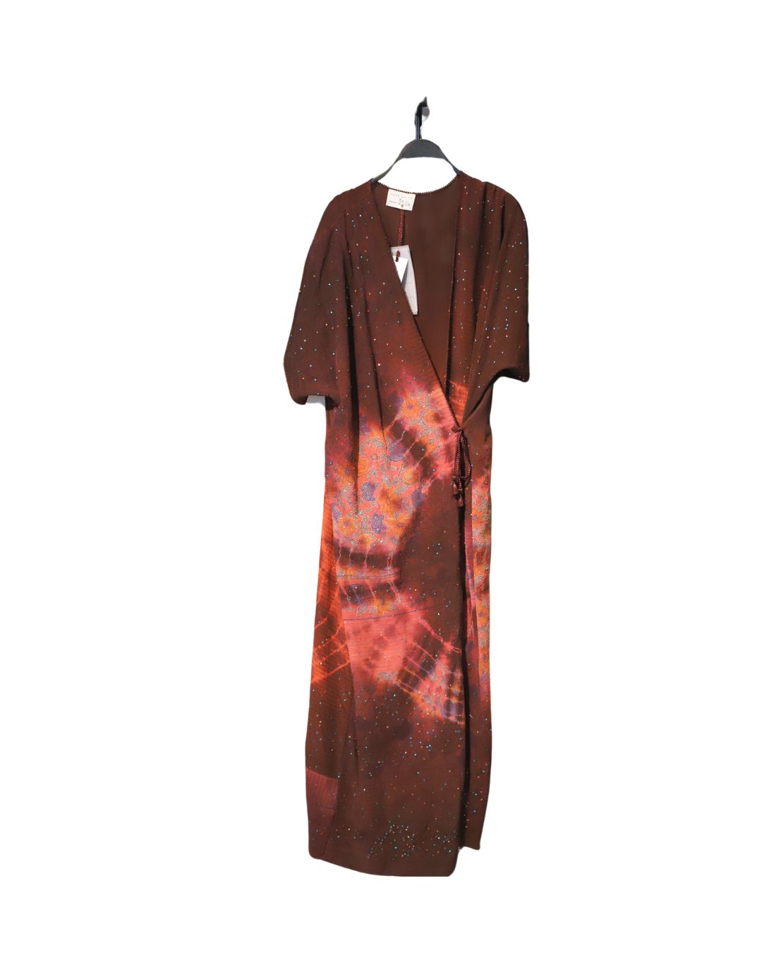 A one-of-a-kind long kimono crafted from vintage silk crepe sari. Designed to be worn open or wrapped, the crossover style gently conceals the chest in a heart-shaped silhouette using a refined tie system. Finished by hand with vegetable-dyed silk thread for a subtle, artisanal touch.