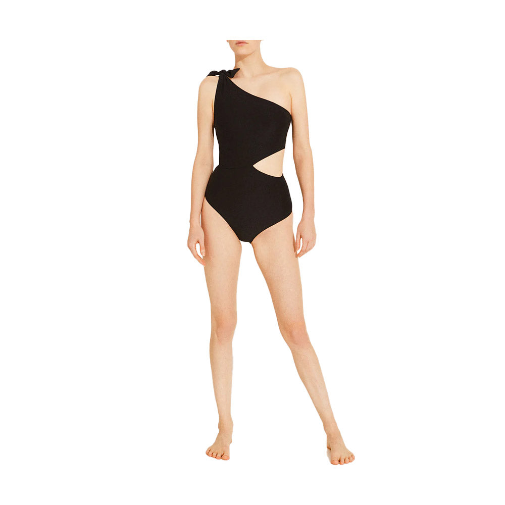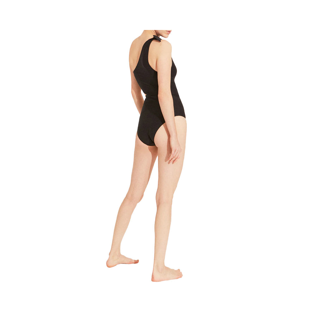 One-piece, asymmetrical swimsuit from RE.SEA, ties on the shoulder, creating a subtle drape. Its cutout at the waist enhances the silhouette. The material is composed of 83% polyamide and 17% elastane. The second skin material adapts perfectly to your body.