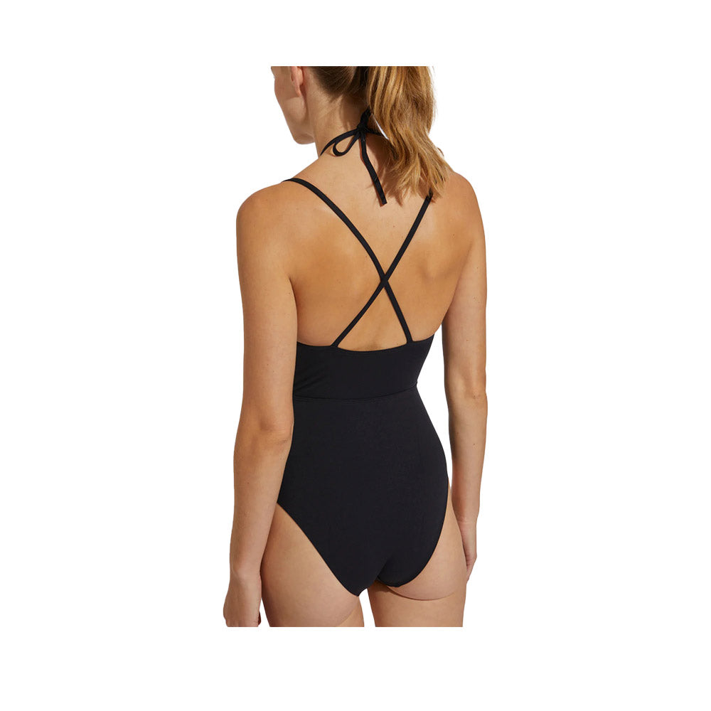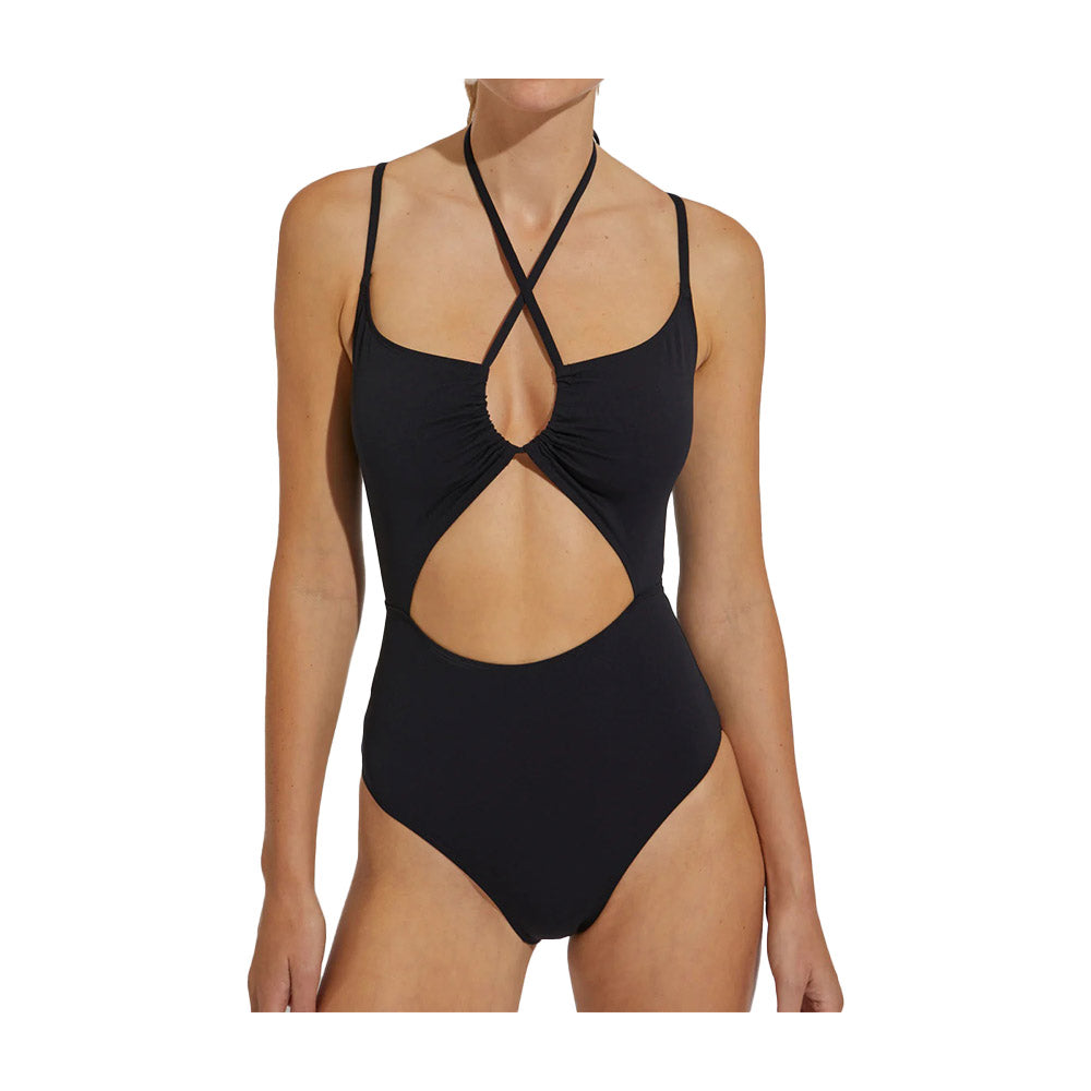 One-piece swimsuit from RE.SEA with straps and cutouts, draped at the chest. The material is composed of 83% polyamide and 17% elastane. The second skin material adapts perfectly to your body.