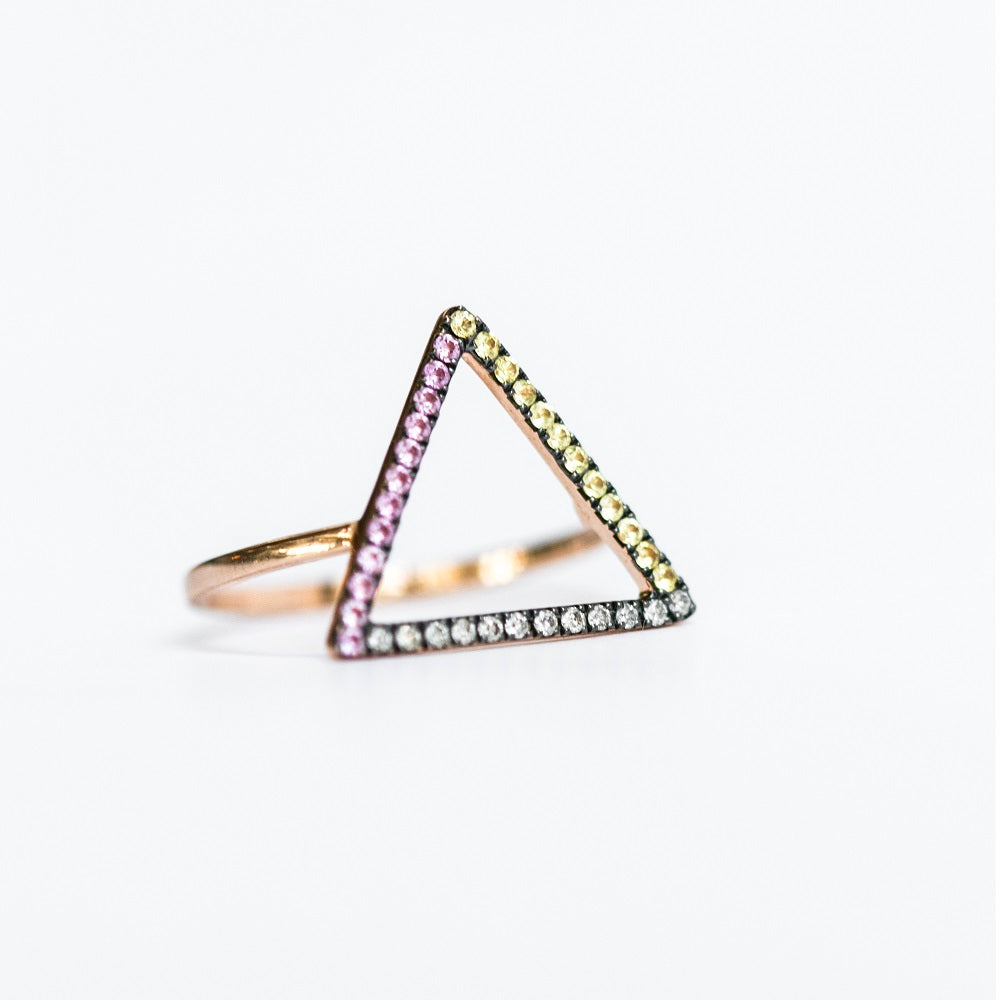 This "Love Triangle" ring By Samantha Tea is crafted from 18k rose gold with pink & yellow sapphires and grey diamonds. The soft colours of this perfect everyday jewel will brighten your ring game.