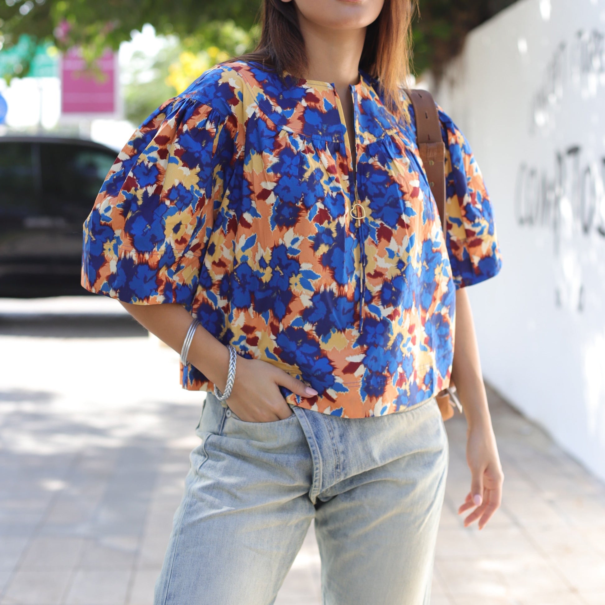 This Ulla Johnson top showcases a floral print, complete with a half zip front, crew neck, and short puff sleeves.
