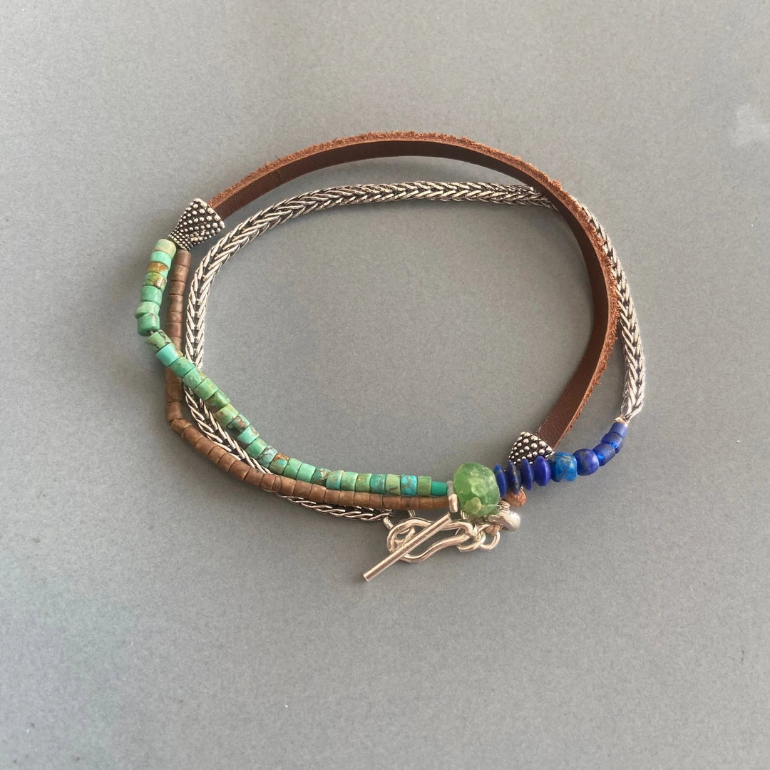 This unique bracelet features a mix of 925 sterling silver, turquoise, lapis, chrysocolla, ancient stones, brown leather. This product is made from natural stones, expect variations in shapes and color.