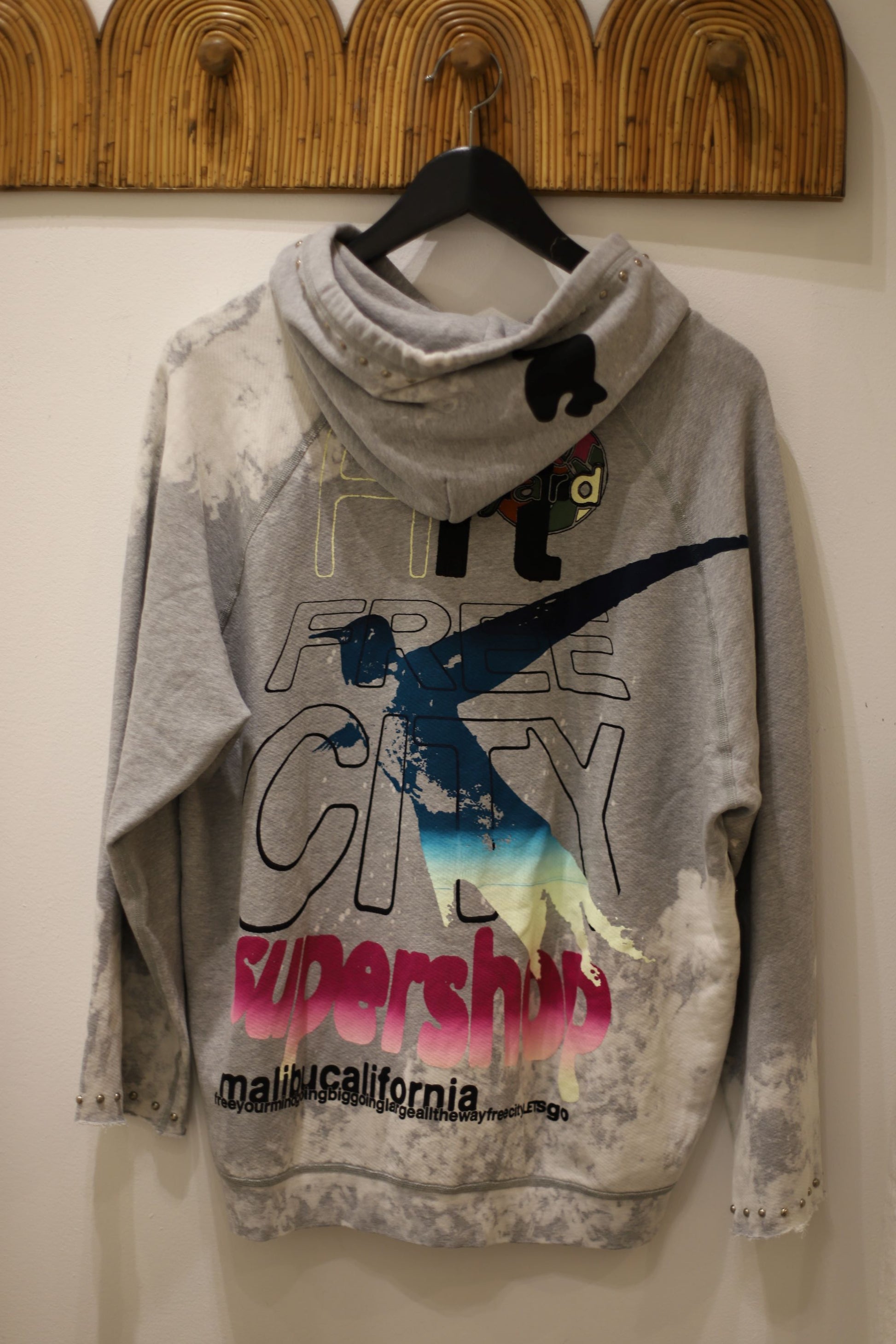 A one-of-a-kind unisex hoodie featuring FREECITY’s signature hand-bleach treatment for unique highs and lows in every piece. Made with 3/4 HOME/CUT sleeves and adorned with vintage silver studs (HOME/STUD) around the hood, pocket, and sleeve openings. Finished with custom prints: “THEDOINGOFITISTHEBEINGOFIT” on the front, black “FREECITYDOVE” on the hood, and a dual-fade “ARTYARD SUPERSHOP” print on the back.
