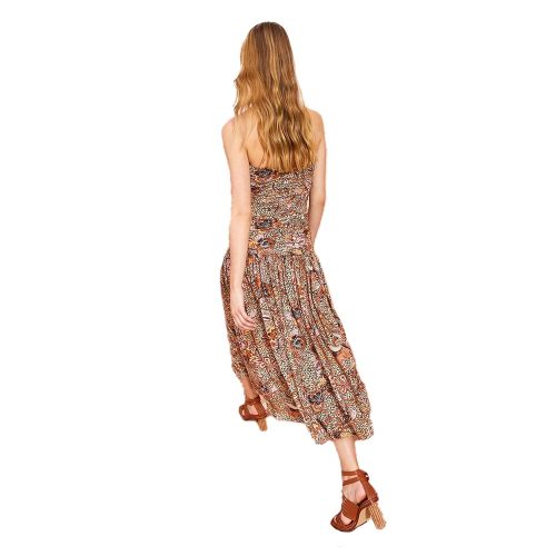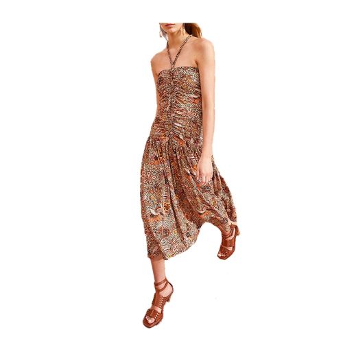 The Marcella Dress is crafted from Ulla Johnson’s wild hibiscus print, in colors of beige, rust and light pink. Made from tissue-thin cotton jersey, this body-skimming maxi dress is defined by its halter neckline, its ruched center seam, and full, beautifully gathered skirt.