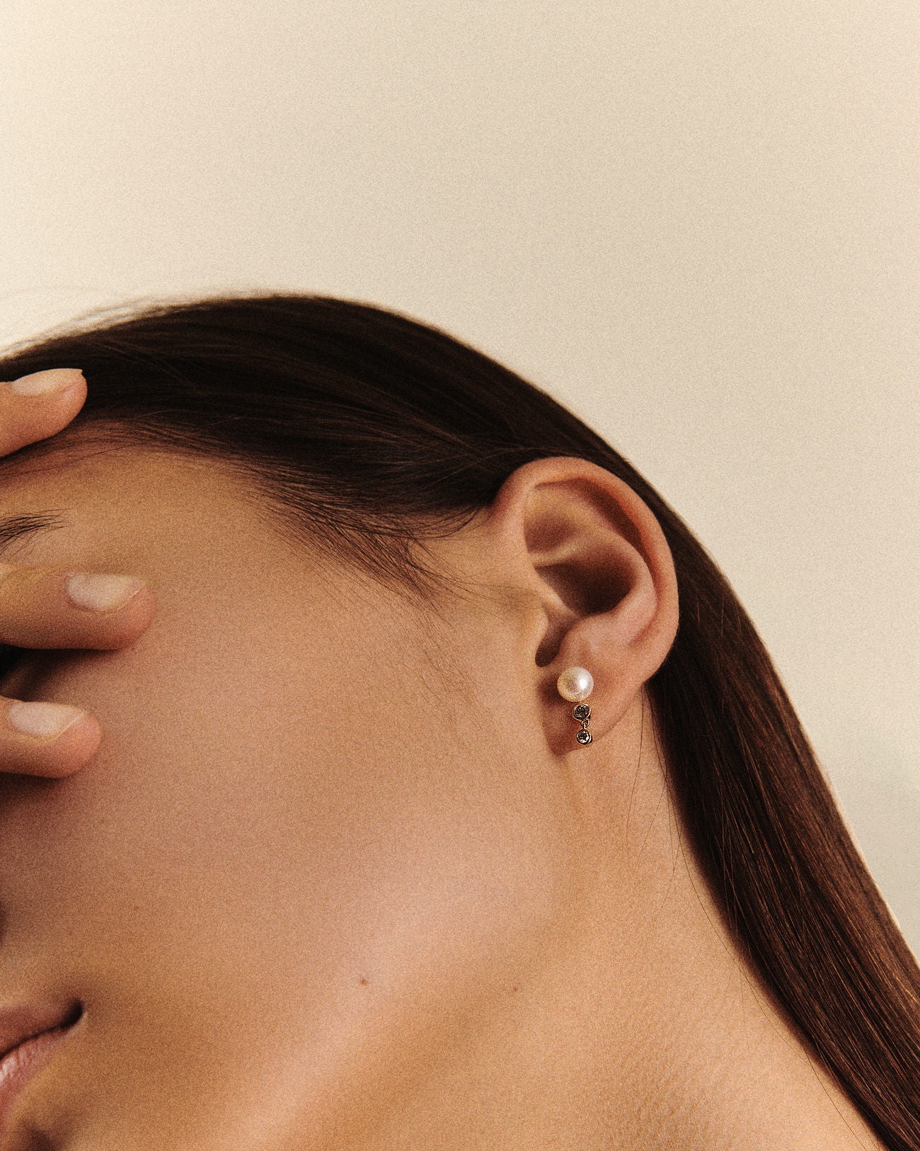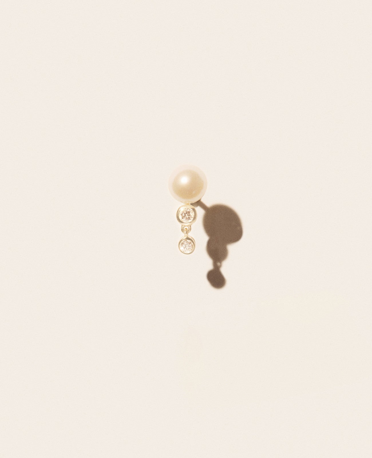 A freshwater pearl stud earring accented with a dangling diamond, for wearing by itself. A mineral material meant to be cherished so it can be kept and handed down.