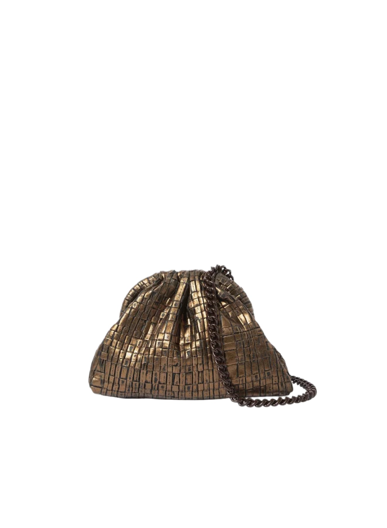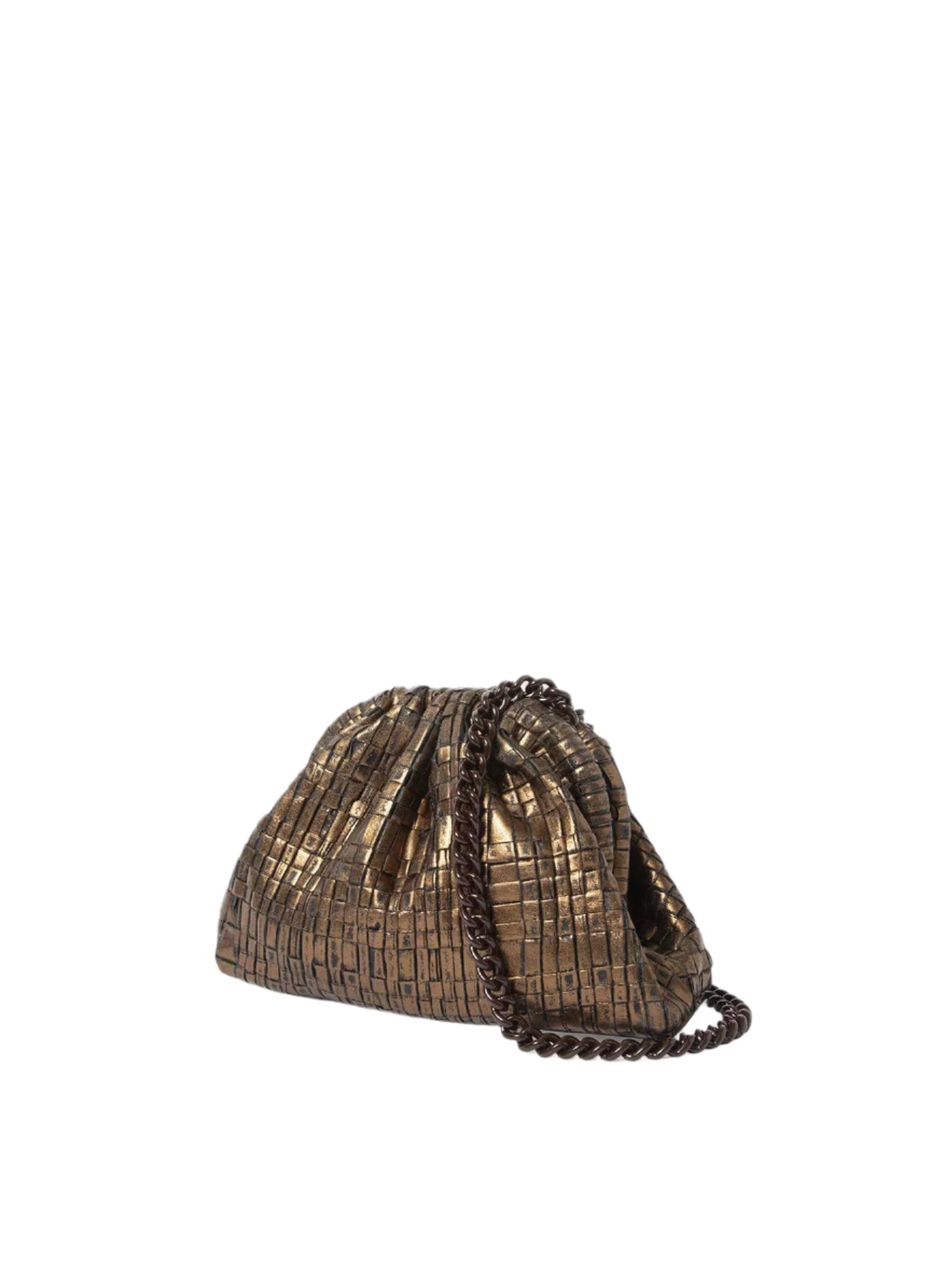 This iconic Maria La Rosa bag is made from laminated woven ribbon fabric that is handmade from antique looms. It comes with a matching chain to wear over the shoulder.
