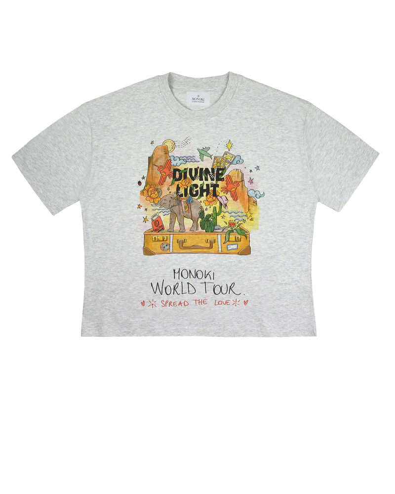 The Monoki "Divine Light" Tee in Grey is a soft, high-quality t-shirt made from 100% cotton. The style features an enchanted MONOKI suitcase graphic along with the phrases "Spread the love" and "MONOKI WORLD TOUR."