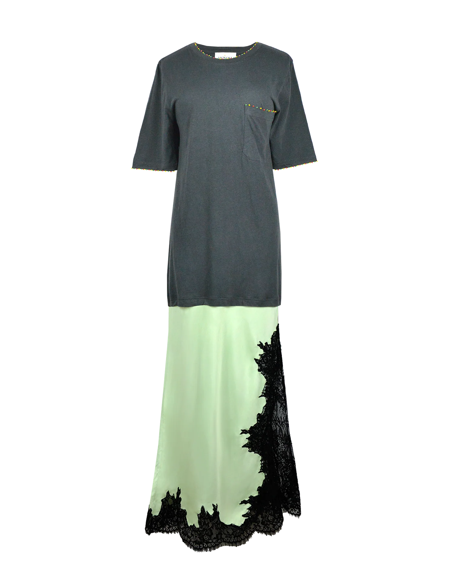 The Monoki Pizza Dress is a unique "One Size" garment designed to blend the comfort of a vintage t-shirt with the style of a refined, lace-trimmed slip dress. Constructed with a soft top made of 100% cotton, it features a relaxed fit for easy, everyday wear.