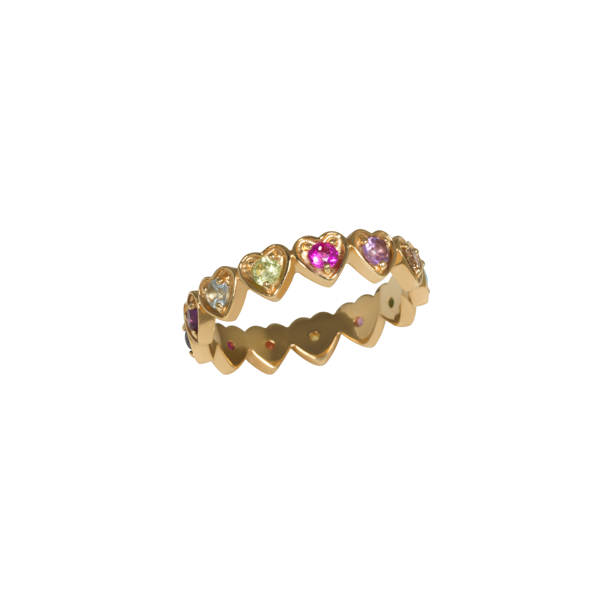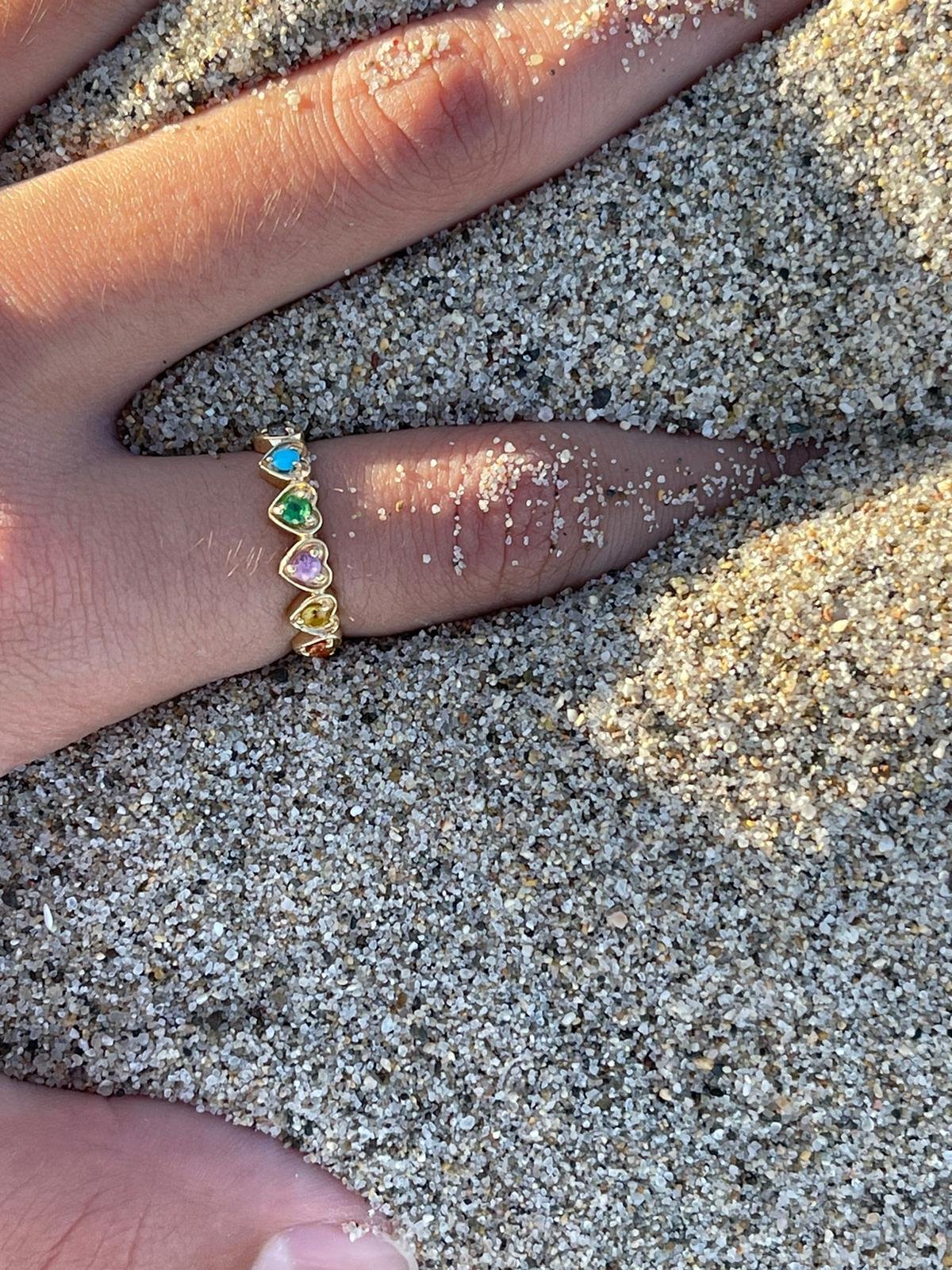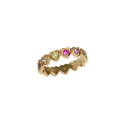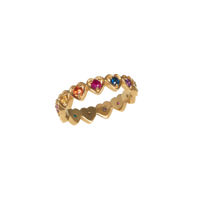 The And Paris Multi Hearts Ring is a vibrant 18K yellow gold ring adorned with an array of colorful gemstones, each set in a heart-shaped motif. This piece showcases a playful yet refined design, making it a standout addition to any jewelry collection.