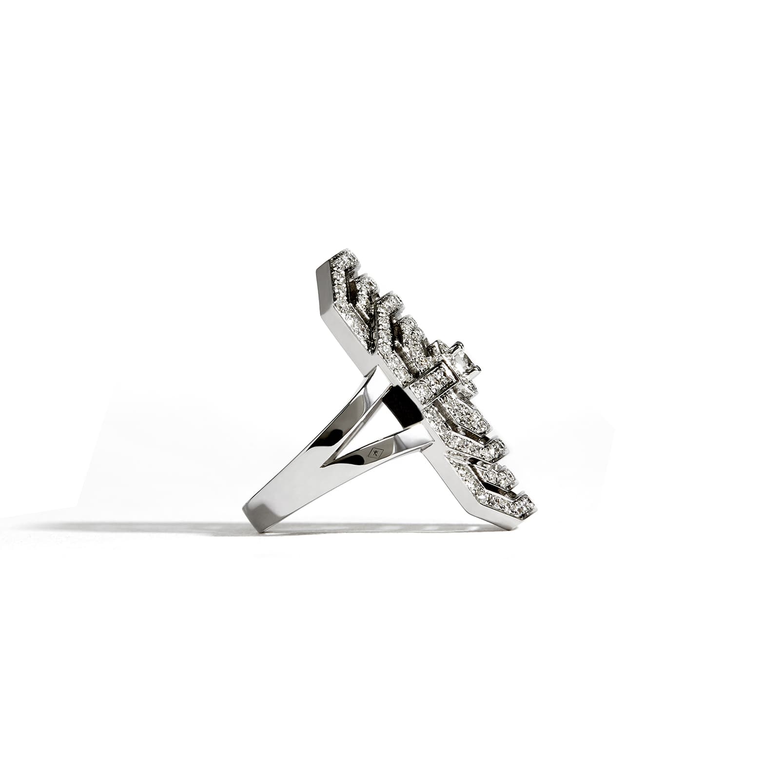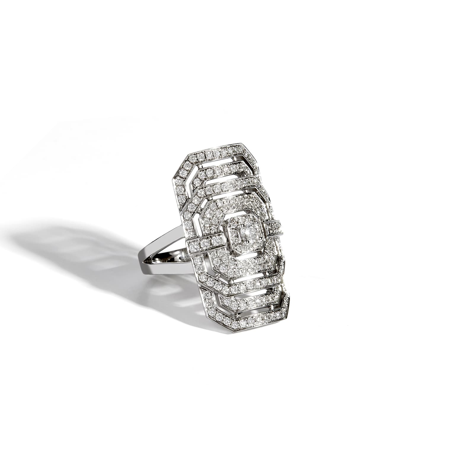An emblem of timeless confidence, the My Way Ring from STATEMENT channels bold architecture and Art Deco elegance. Crafted in rhodium-plated sterling silver, its octagonal form is traced by a pavé of brilliant-cut diamonds that catch light with a refined sparkle. This sculptural piece feels powerful yet effortlessly modern—perfect as a statement solitaire or layered with other signature designs.