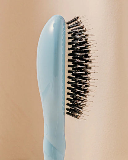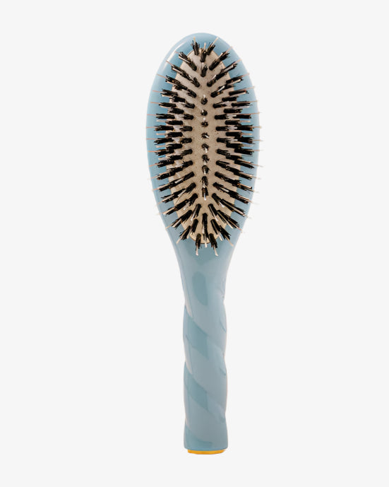 Compact yet powerful, this travel‑sized brush blends keratin-rich boar bristles with soft nylon fibers to gently detangle, nourish, and polish your hair. Its flexible rubber cushion massages the scalp, boosting circulation and supporting healthy hair growth. Perfect for all hair types—from fine to thick—it smooths strands, reduces breakage, and enhances natural shine. A styling must-have, beautifully finished in muted almond green and crafted in France for effortless elegance, anytime, anywhere.