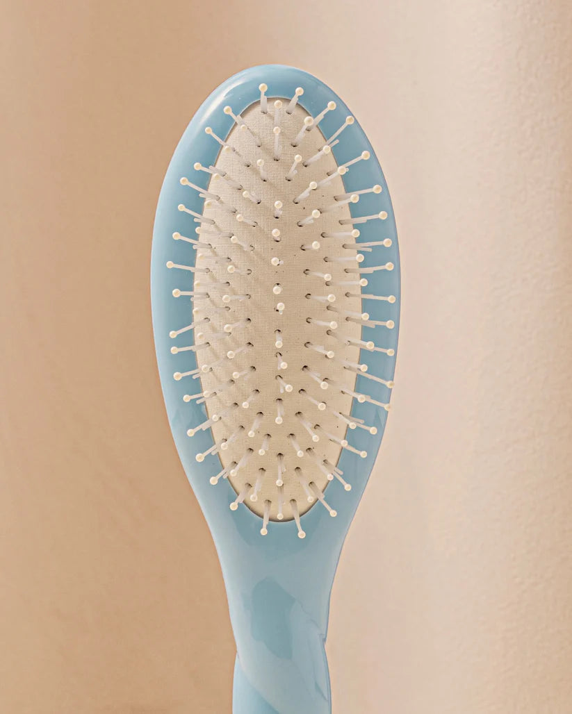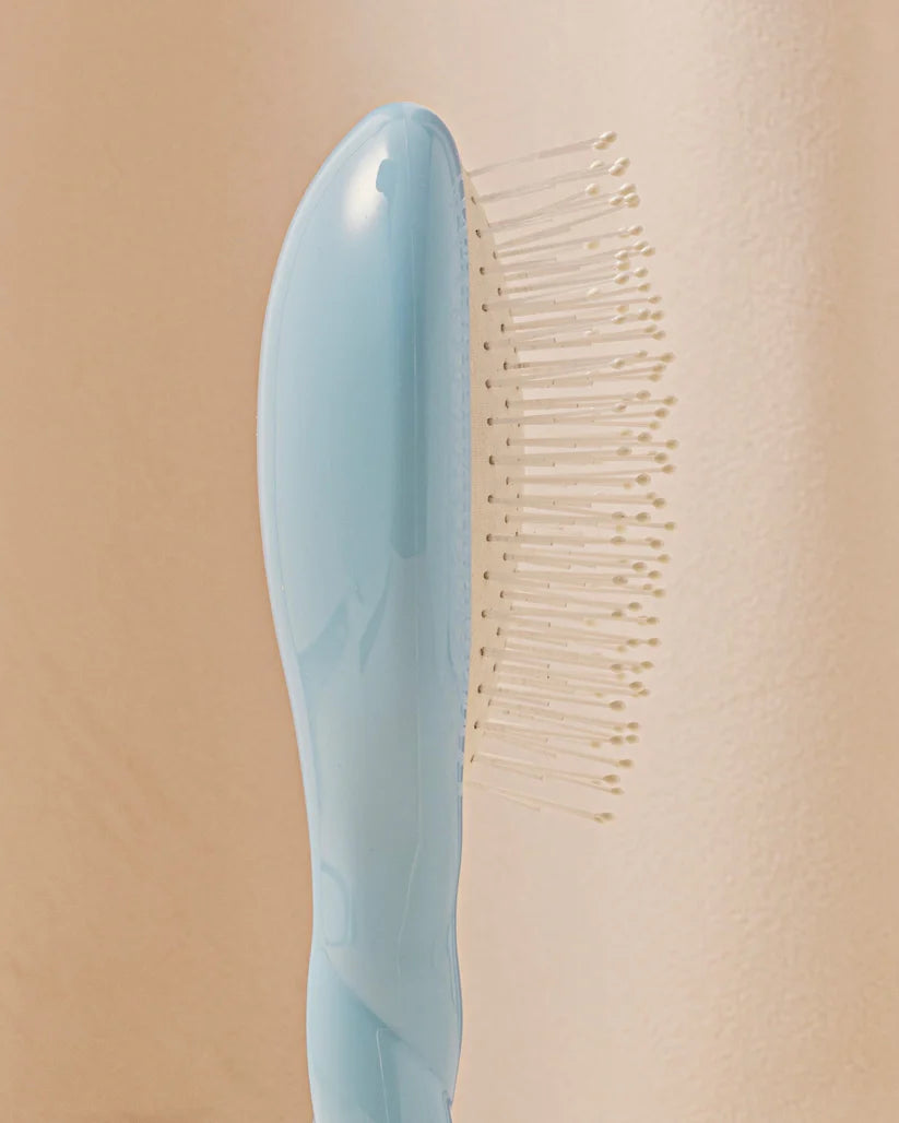 A petite detangling brush designed for tactile luxury and scalp wellness. Crafted with flexible nylon bristles tipped in epoxy balls, this vegan brush gently untangles hair while delivering a calming shiatsu-inspired scalp massage. Its sky-blue compact profile fits effortlessly into your curl-care routine or on‑the‑go ritual.