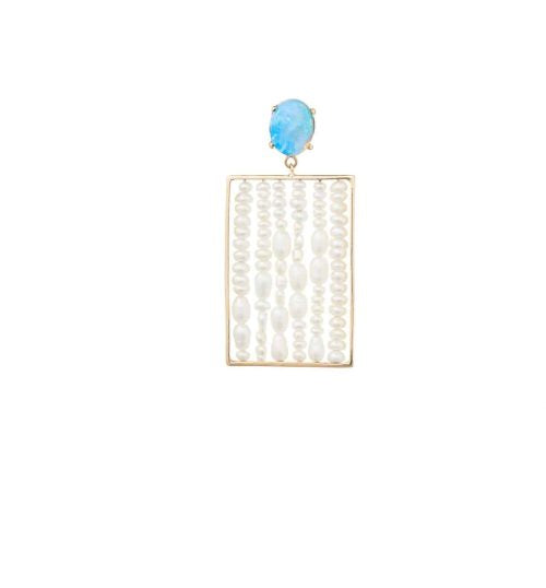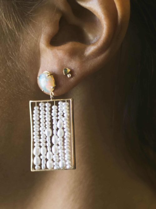 14K Letter Earrings Lines of delicate freshwater pearls in varying sizes evoke a tapestry. This Opal & Pearl Earring from Wwake is framed in gold and suspended from a brilliant opal, these earrings are equally contemporary and classic.