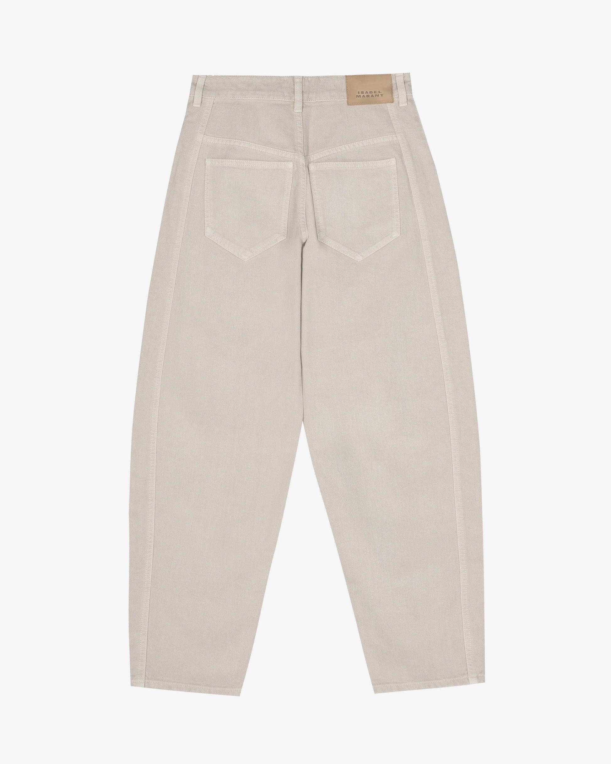 The Isabel Marant Oriane Pants in ecru are denim reimagined with casual sophistication. Cut in a graceful barrel-leg silhouette from rigid cotton, they sit at a poised mid-rise and hug the waist before gracefully widening. Subtle silver-tone rivets, a hidden zip, and a sculptural back leather logo elevate the classic five-pocket design. Whether paired with a crisp blouse or tucked-in tee, they bridge bold structure with laid-back ease—an everyday silhouette that feels both confident and effortlessly modern.