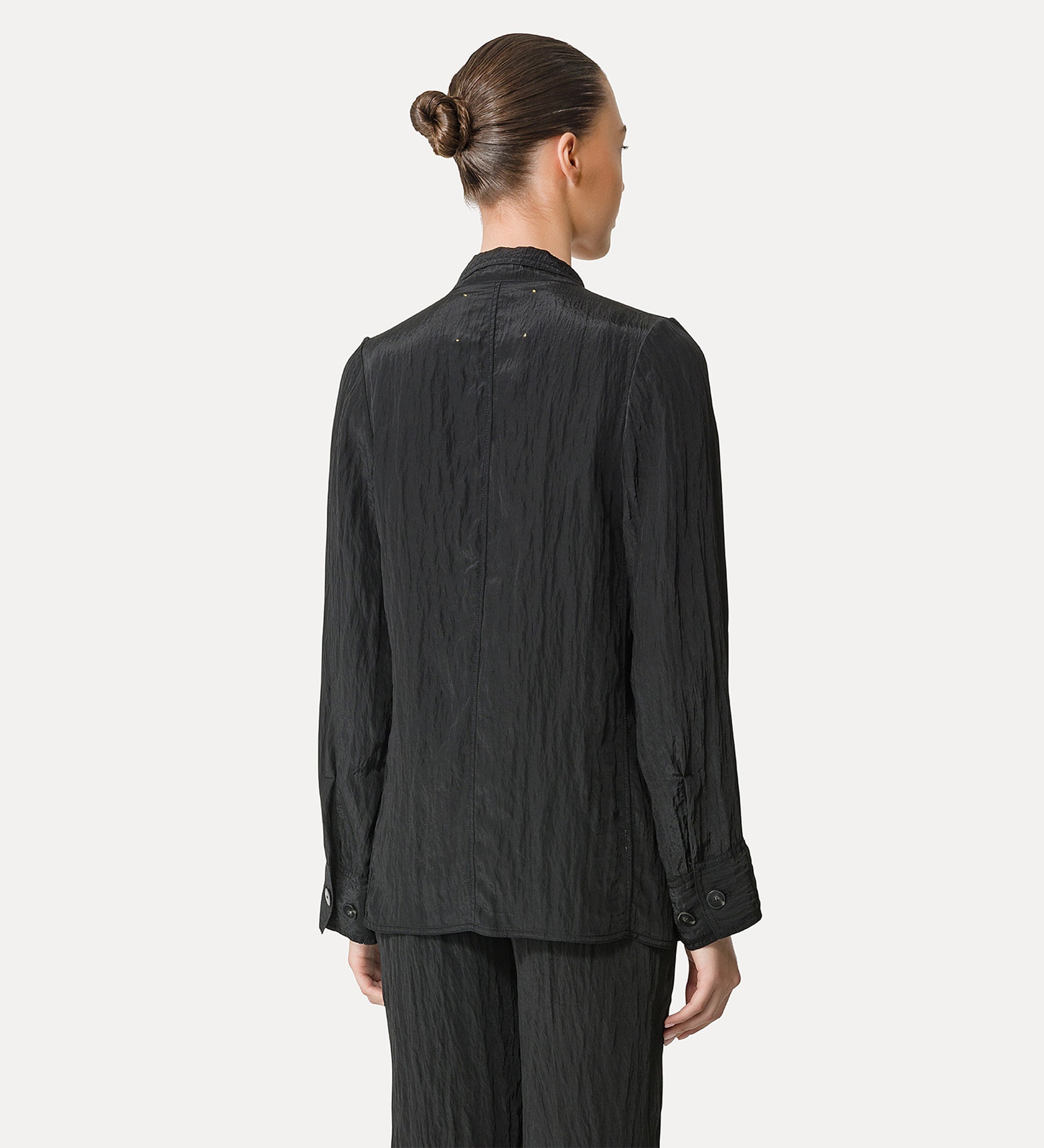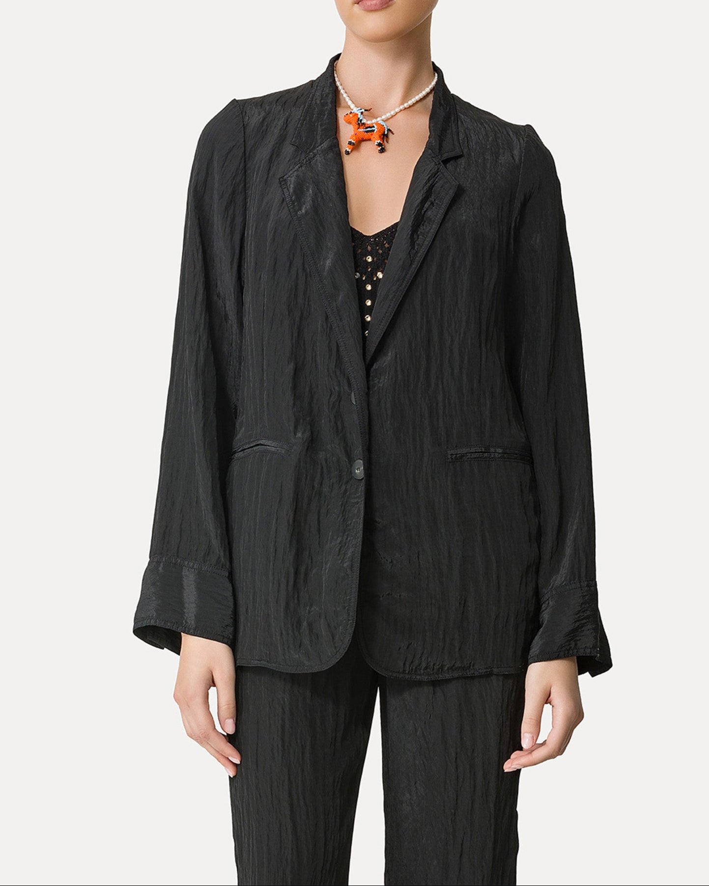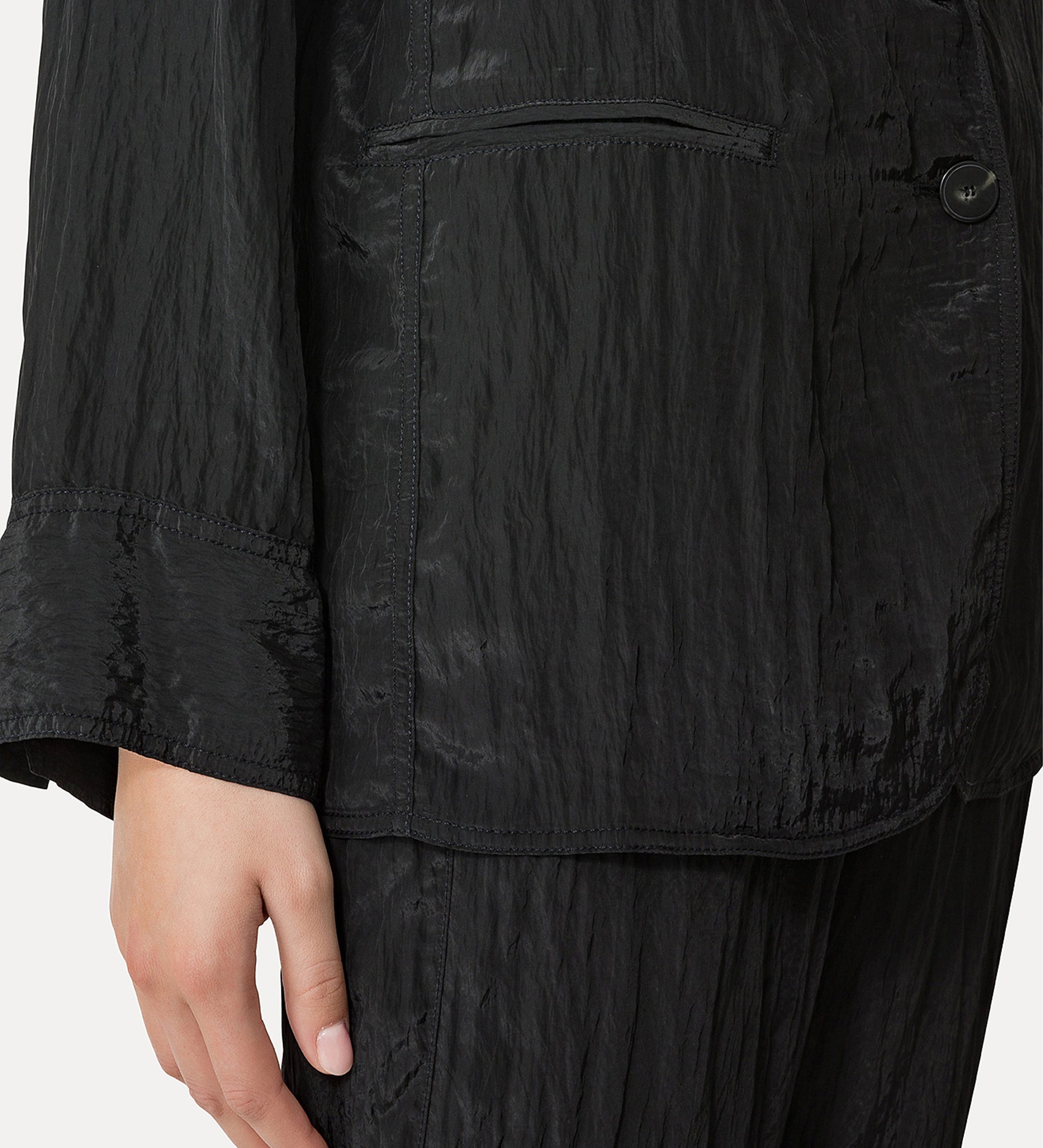 This oversized women’s jacket pairs clean tailoring with the subtle drama of crumpled viscose satin. Featuring a loose cut, shirt cuffs, and jet pockets, it moves effortlessly from aloe green to nocturnal black — a luminous take on understated elegance.