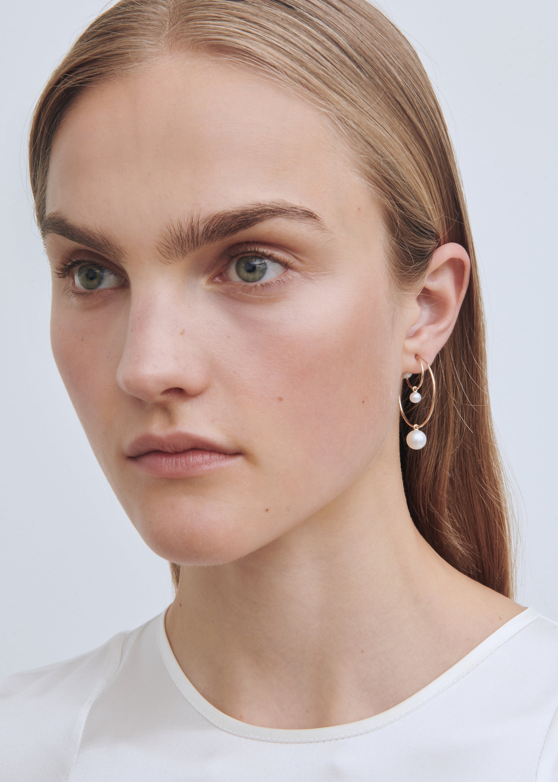 14k yellow gold earring adorned with freshwater pearls in varying sizes.