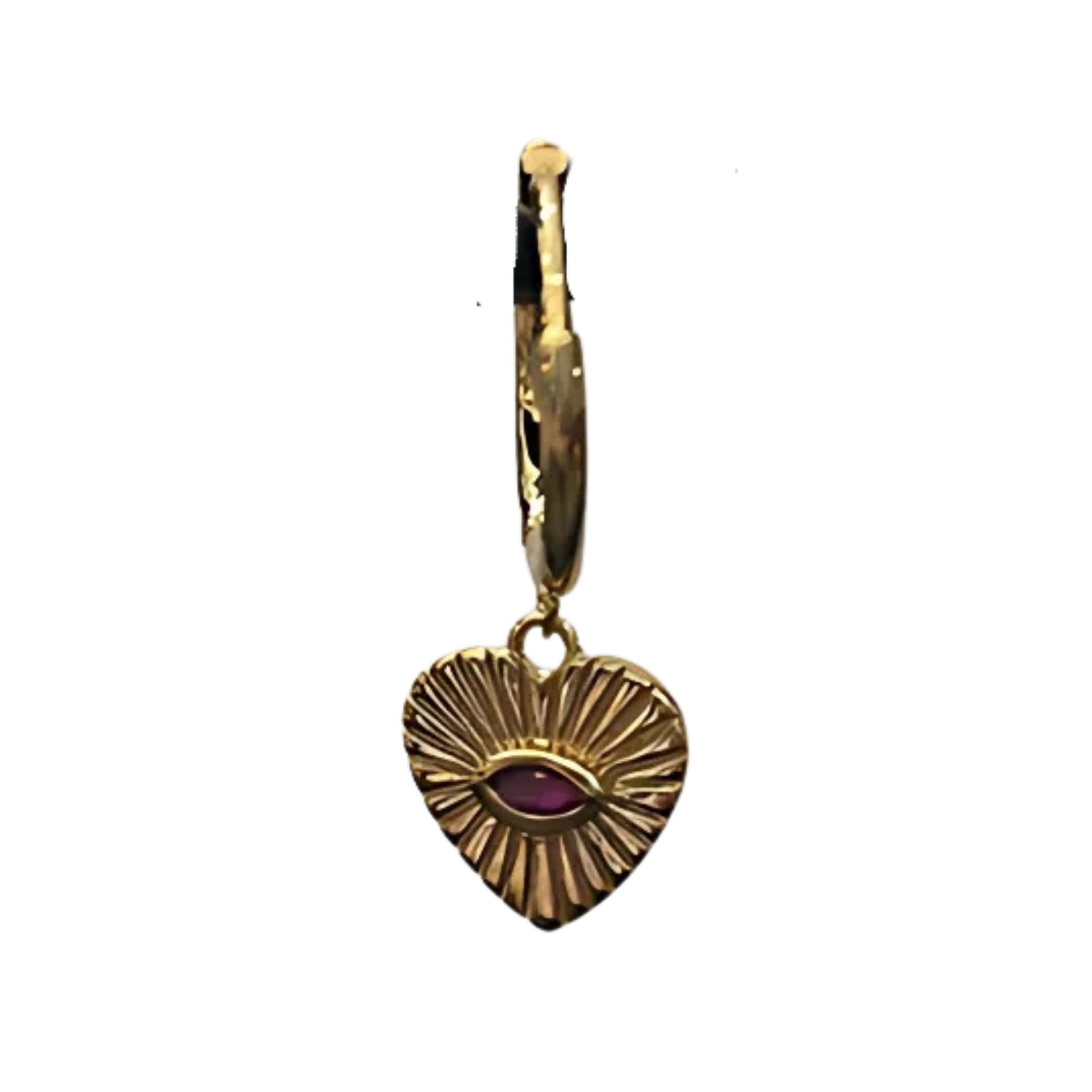 This playful-yet-refined huggie blends delicate detailing and unique charm. The earring features a smooth gold hoop—lightweight, comfortable, and sized to hug your earlobe—topped by a dangling heart-shaped charm with a vibrant pink eye at its center. The eye motif is subtly embedded, giving the piece personality and a touch of mystique.