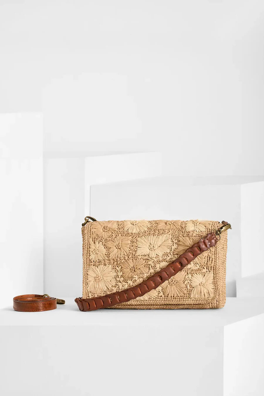 The Ravina Rectangular Baguette Bag by Ibeliv is a compact and versatile handbag that combines natural elegance with practical design. This bag is 26 cm long, 15 cm high, and 5.5 cm wide, with two magnetic snap closures and two removable shoulder straps of varying lengths—one in waterfall braided leather and the other in flat leather—for versatile styling options. The bag has a convenient patch pocket for your cards.
