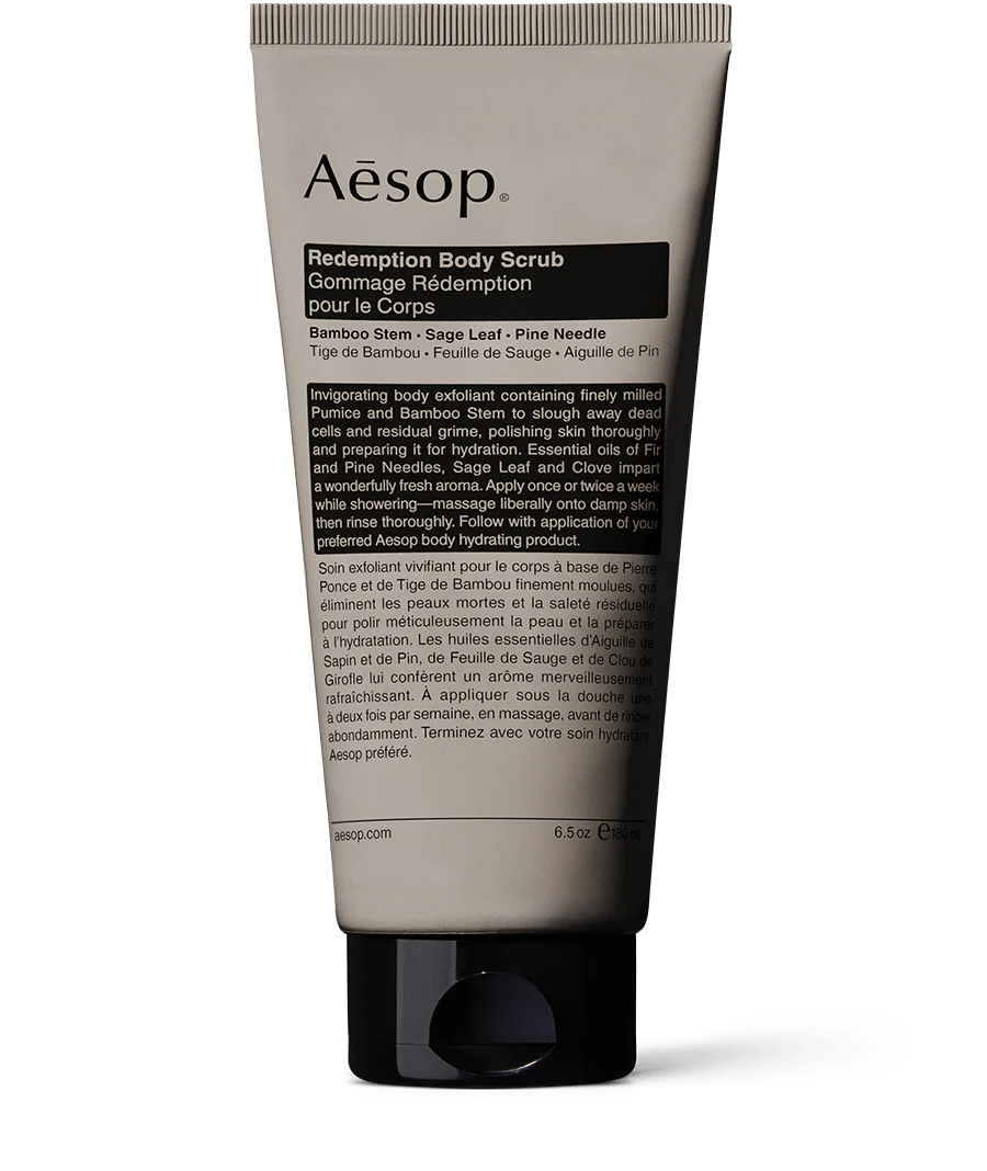 The Aesop Redemption Body Scrub is a spirited ritual of renewal—an opaque, fine-grain gel that exfoliates with grace. Delicate yet effective, its pumice and bamboo stem particles cleanse while aromatic botanicals—pine needle, sage leaf, rosemary, clove, and cedarwood oils—enliven the senses with a fresh, alpine breeze. In just a moment beneath warm water, dry, weary skin emerges polished, soft, and primed for rich hydration.
