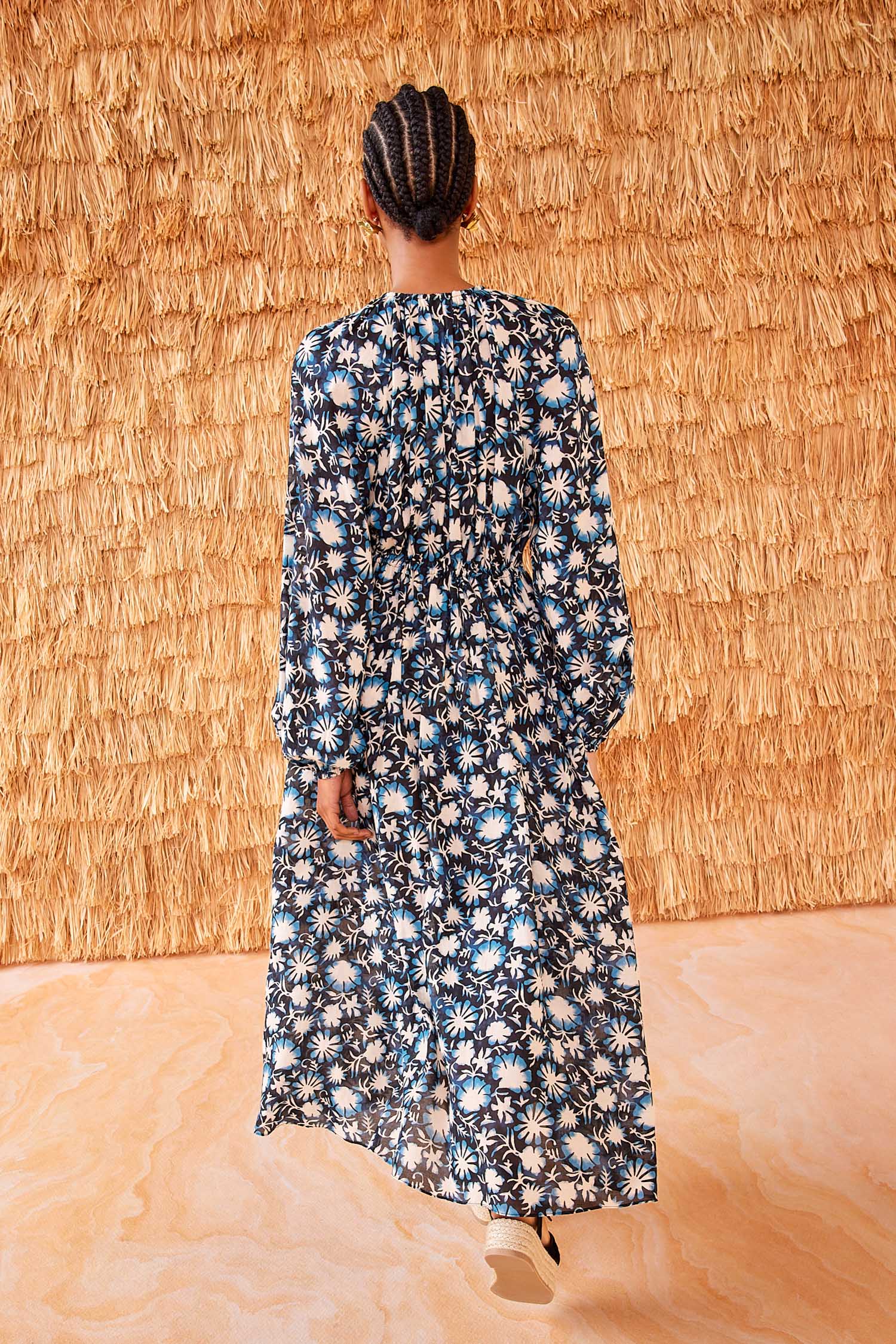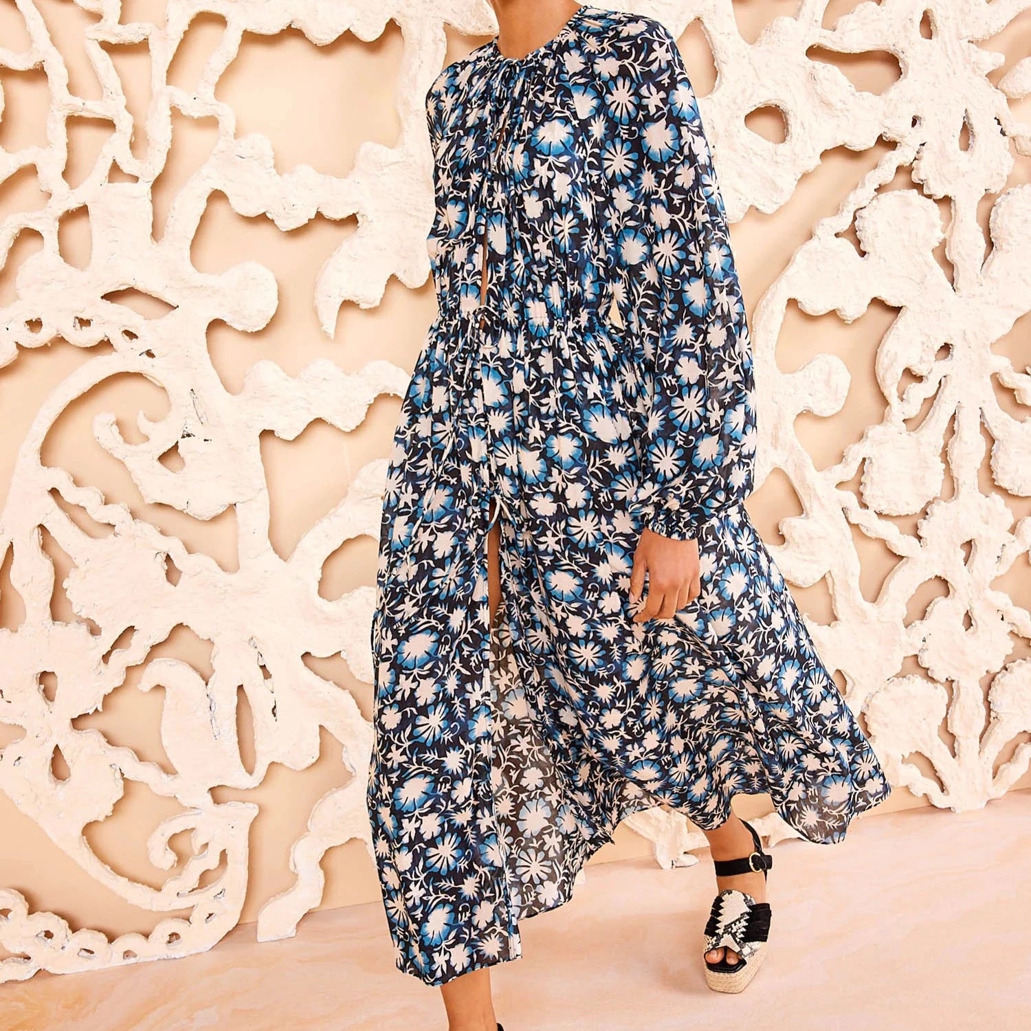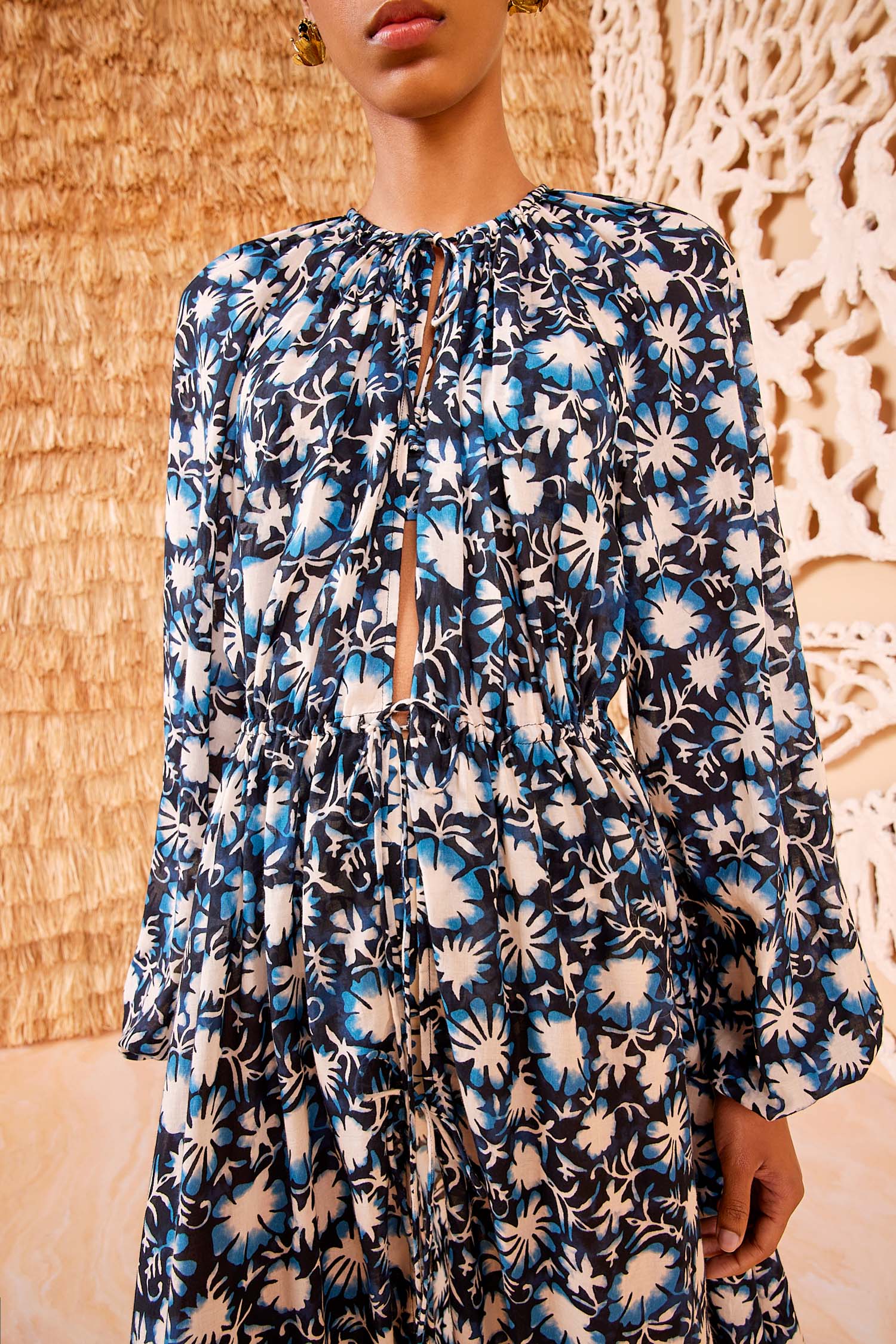 The Renata Coverup is a beautiful and versatile piece that can be styled with the ties either open or closed. Made from airy cotton, it showcases a vibrant Sunprint pattern in shades of blue and falls to a midi length.