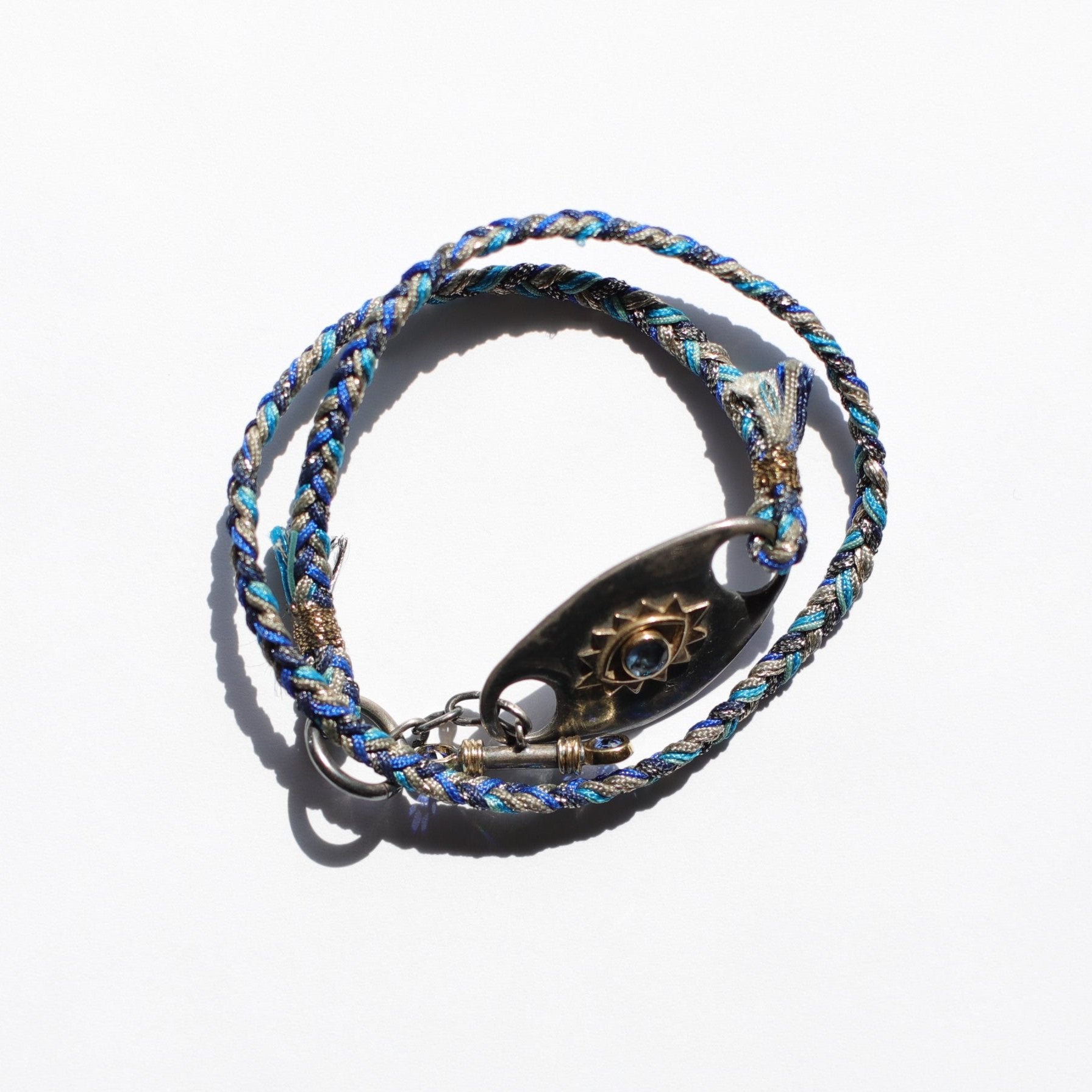 This bracelet features a double-wrap silhouette crafted from a vibrant blue cord, providing a comfortable, adjustable fit and a laid-back, yet colorful, foundation. The centerpiece is the protective Evil Eye charm, typically set on a 10K gold plate and centered with a deep, rich sapphire.