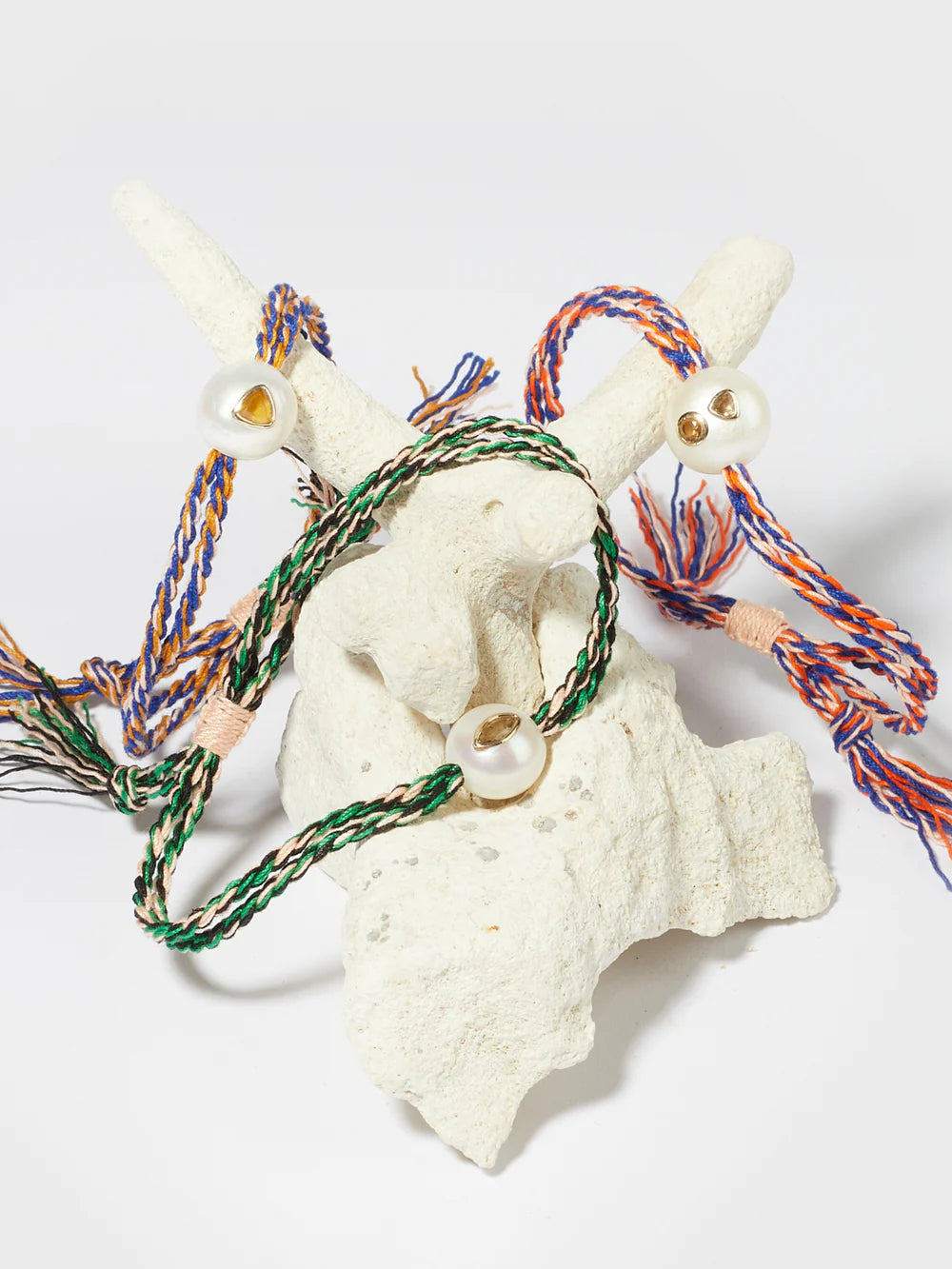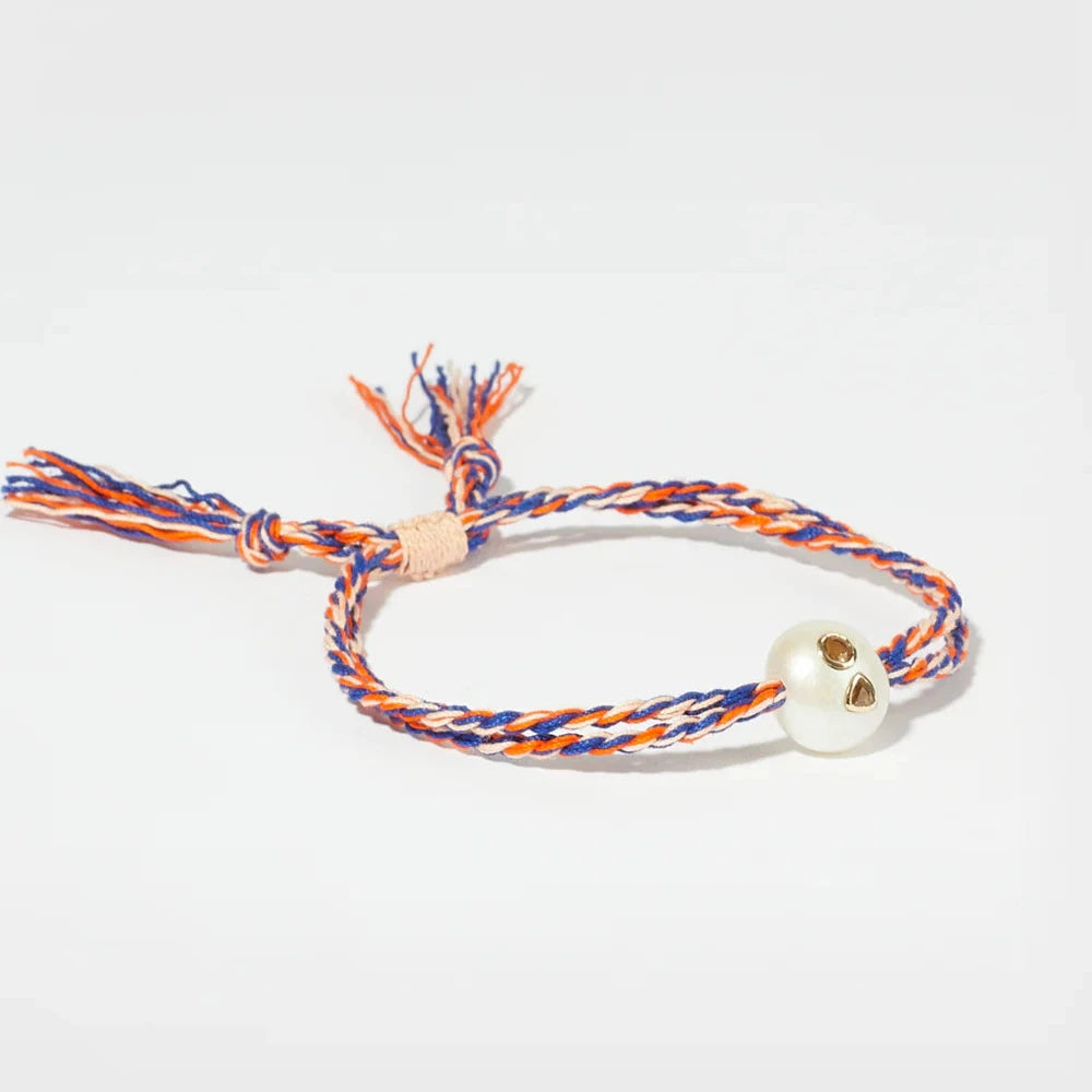 Pearl bracelet set with changing garnets, mounted on an adjustable multi-colored cord.