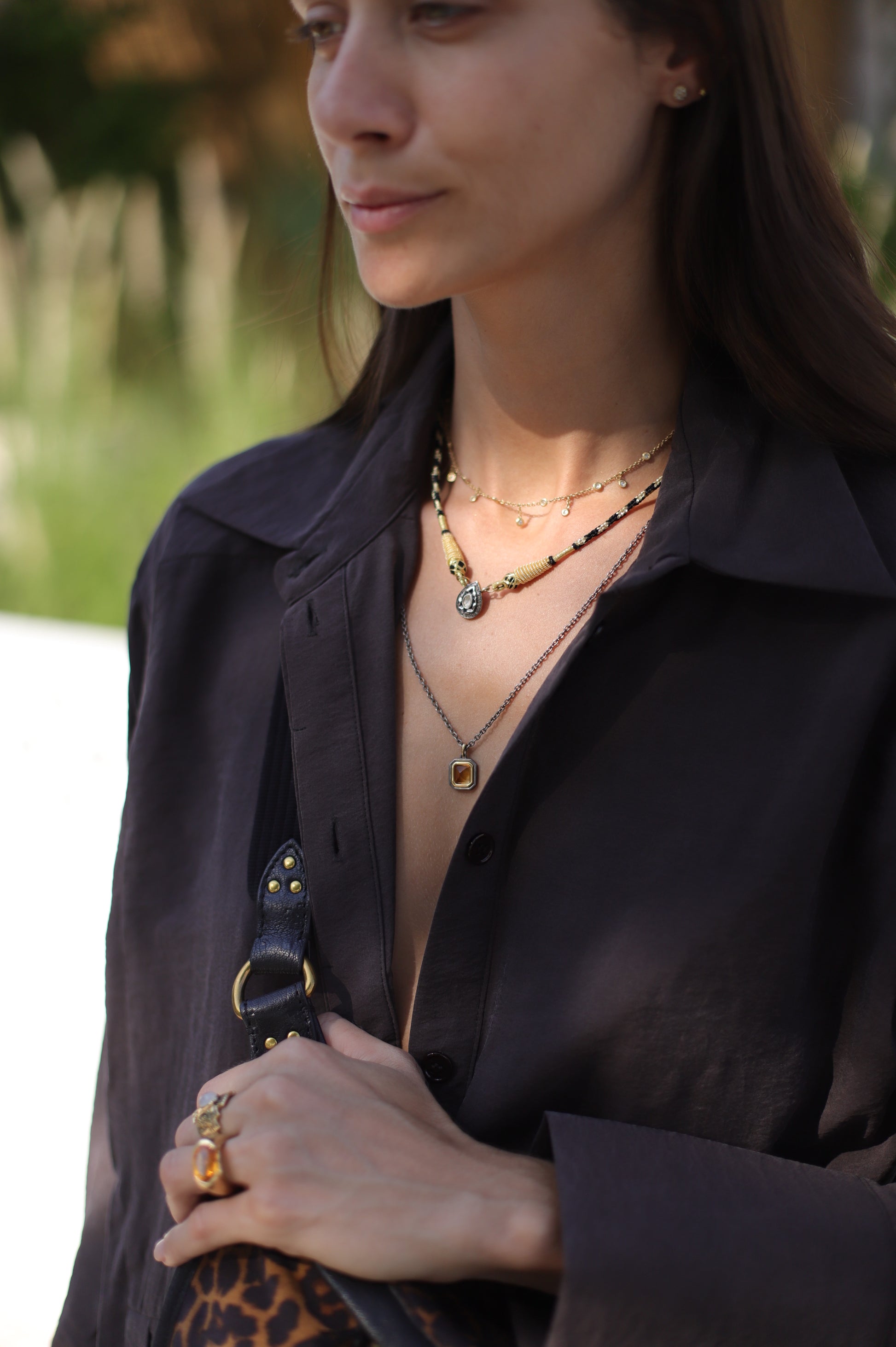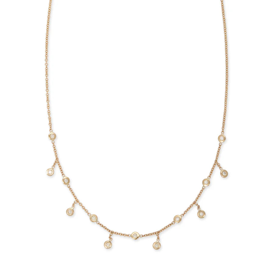 Ethereal and effortless, this necklace captures Jacquie Aiche’s signature aesthetic: delicate yet luminous. A fine 14k gold chain is punctuated with a half‑circle of floating diamond "shakers" that sway softly with every movement. Designed to layer gracefully or stand alone, this piece feels both wearable and richly refined.