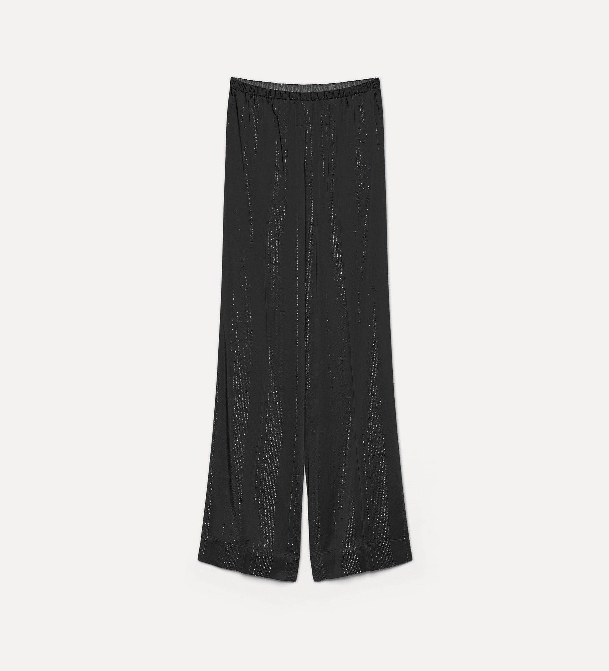 Effortlessly refined with a liquid drape, these satin trousers feature shimmering pinstripes that catch the light with subtle allure. Designed with a mid-rise, elasticated waist and a relaxed straight leg, they blend comfort with quiet elegance. Whether styled with the matching jacket or worn solo, they elevate tailoring with soft fluidity and enduring sophistication.