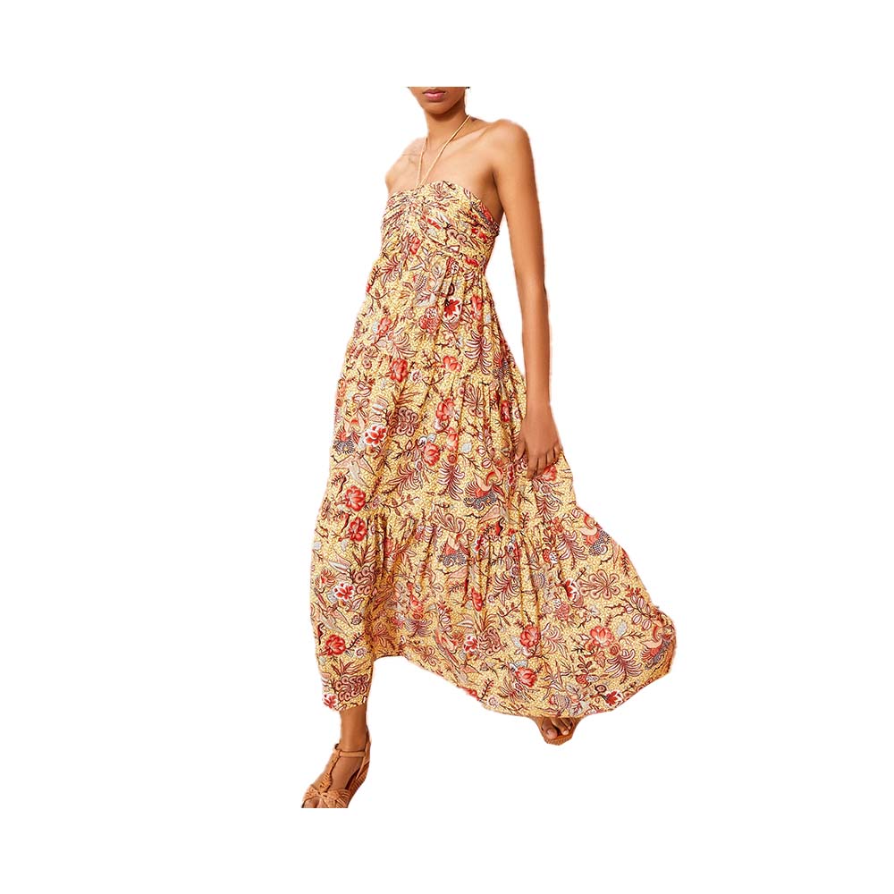 The Siya Coverup is an elegant maxi-length silhouette crafted in Ulla Johnson's batik-inspired floral print. This breezy, lightweight cotton-blend dress is defined by its elegant V-neck halter detail, ruching at its fitted bust, and a flowing tiered maxi skirt.