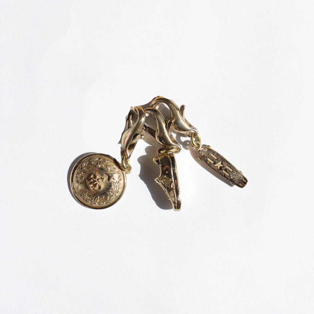 Introducing The Icon Set - a set of 3 golden brass charms by Golden Goose. Includes a skateboard, sneaker, and circle crown. it has a lobster clasp, perfect for accessorizing any bag.