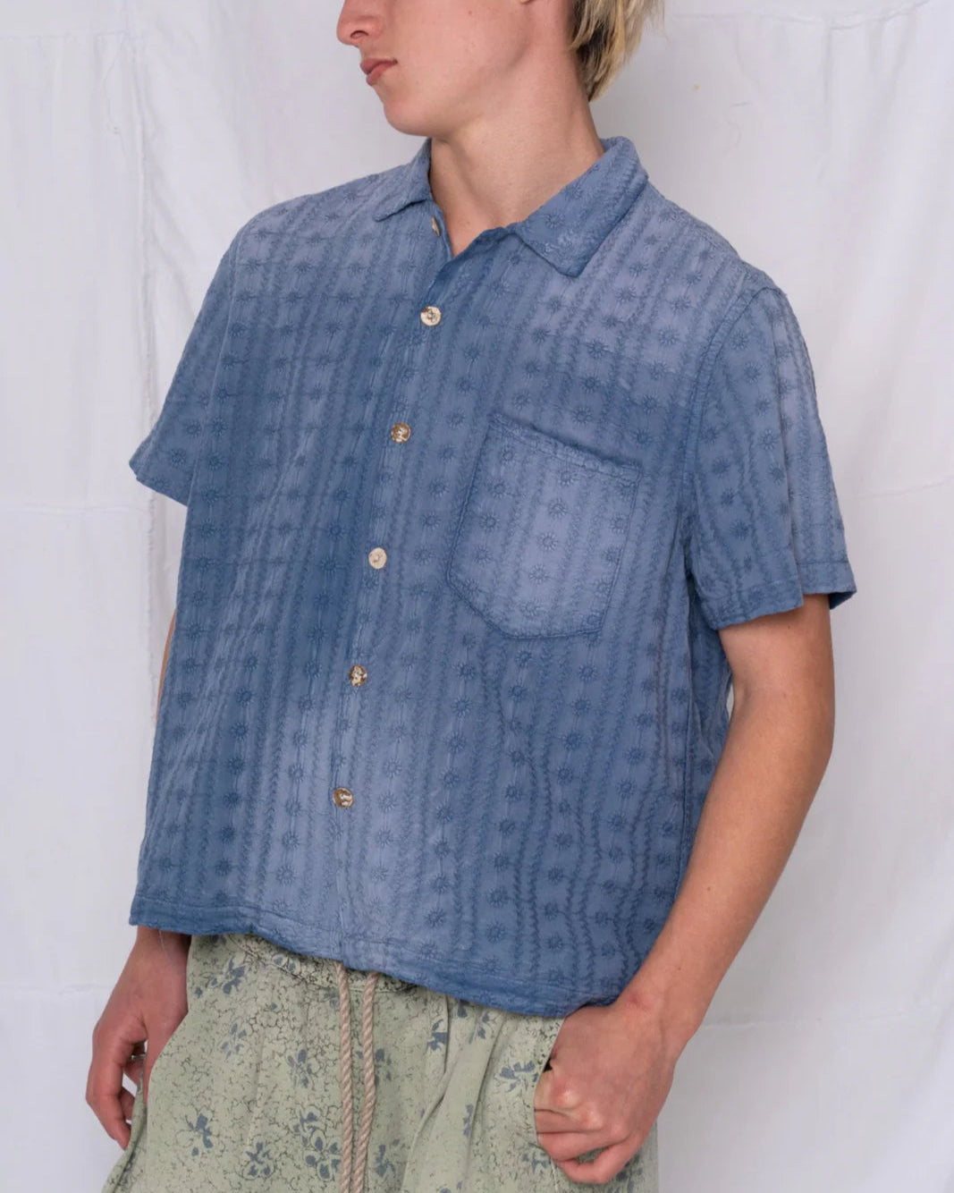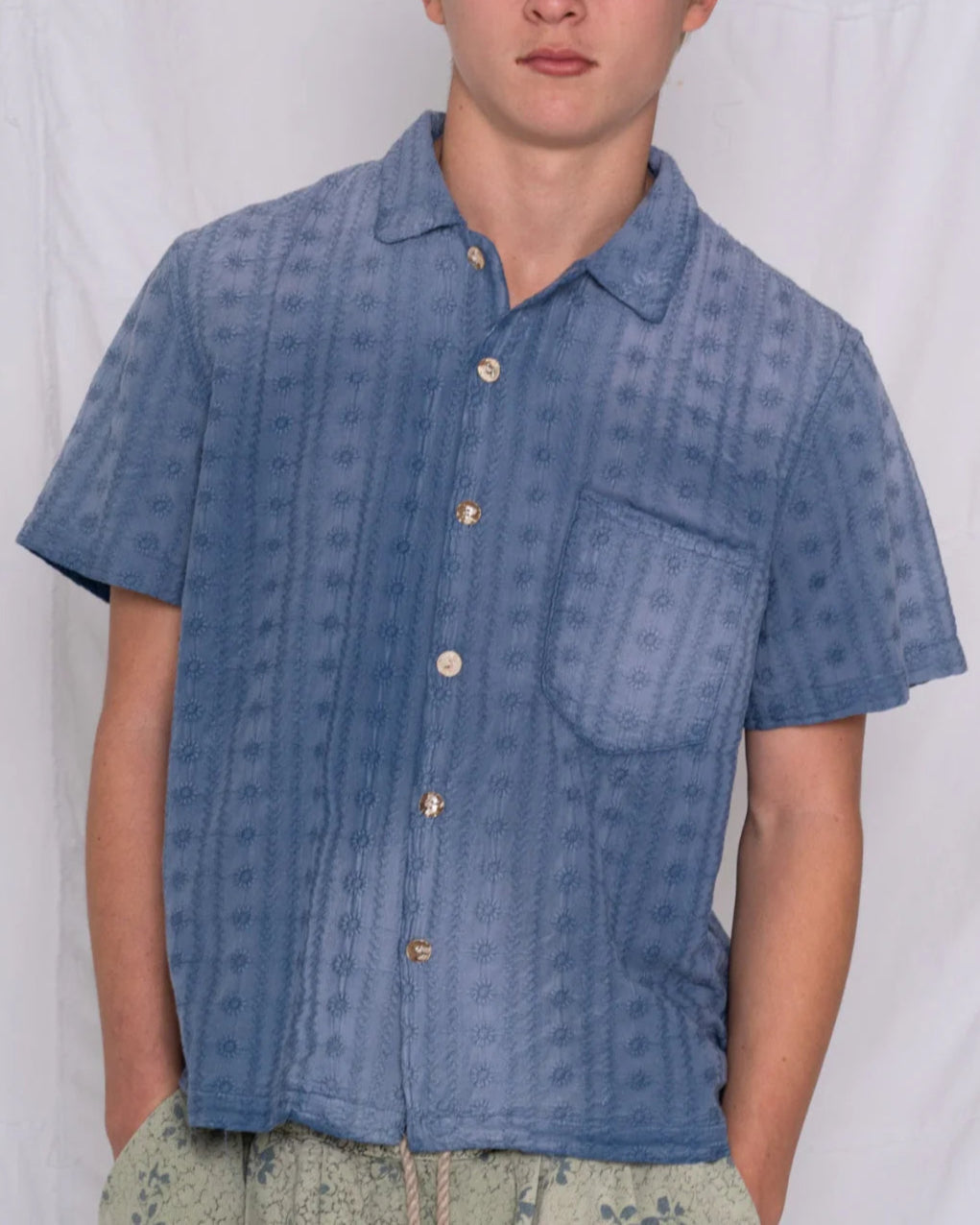 A vintage-inspired classic with a modern twist. Made from super soft, lightweight sunflower jacquard fabric, this short sleeve camp shirt features a relaxed, loose fit and a naturally aged, faded look thanks to a hand-applied sunfaded wash.