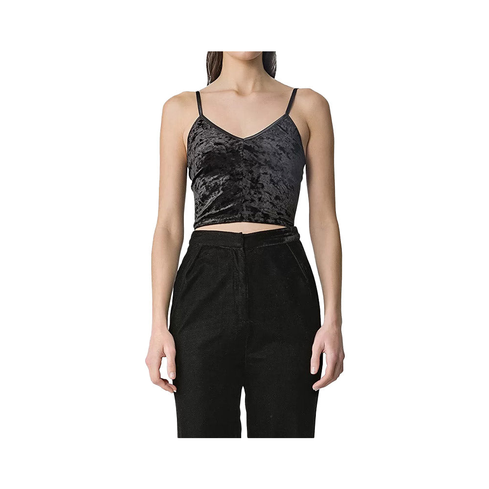 Introducing a new V-neck crop top, delicately supported by slender spaghetti straps and crafted from stretch velvet. Embracing a form-hugging, feminine allure, its unique moiré pattern elevates the color scheme, injecting vibrant energy and individuality into this chic wardrobe essential.