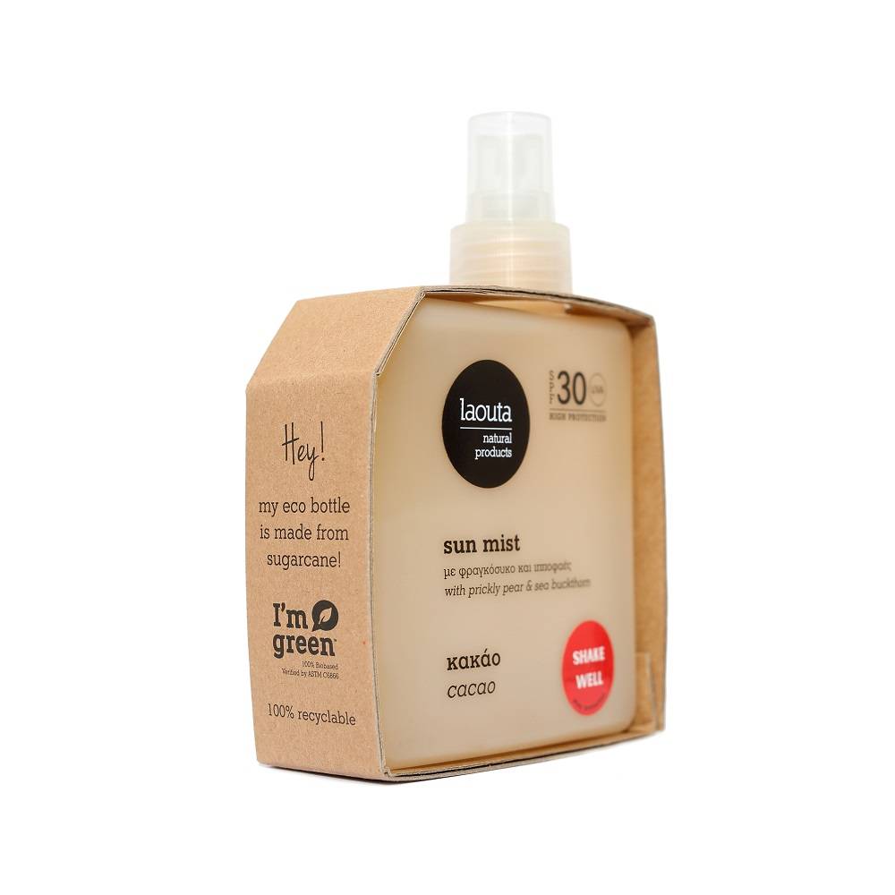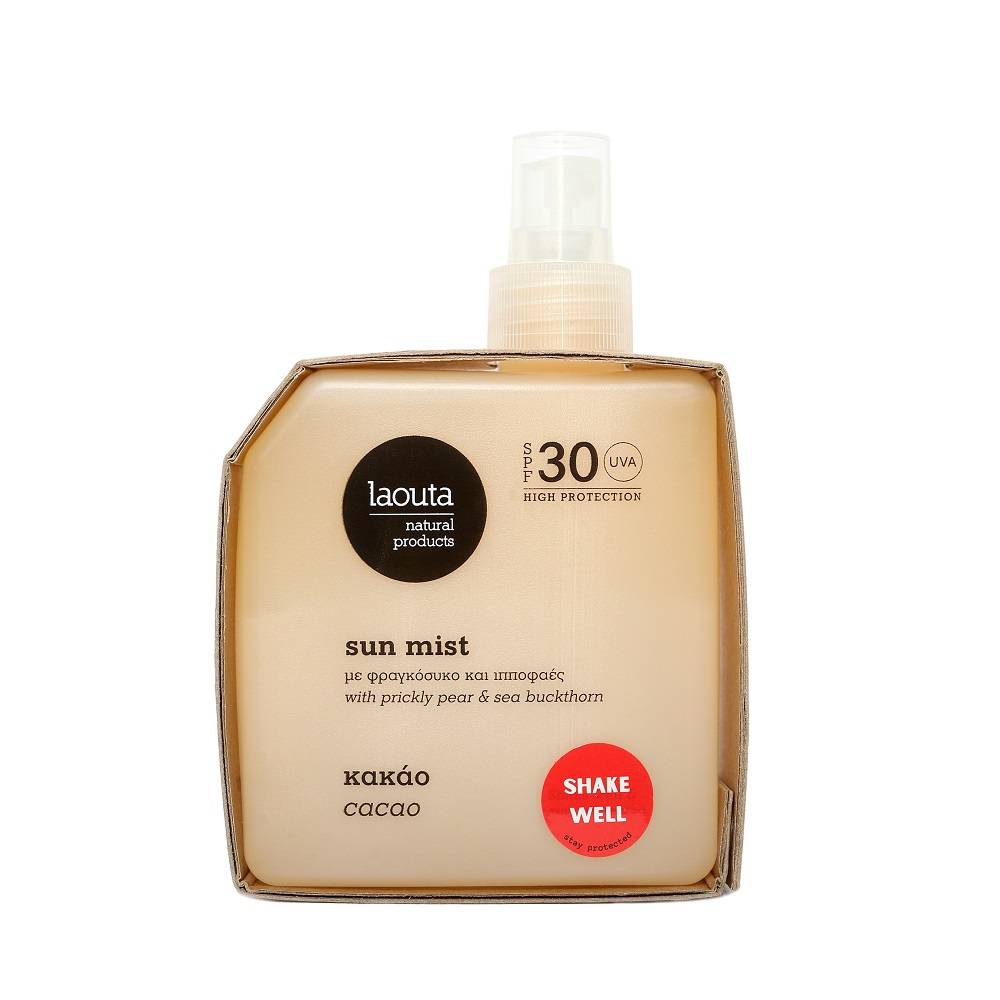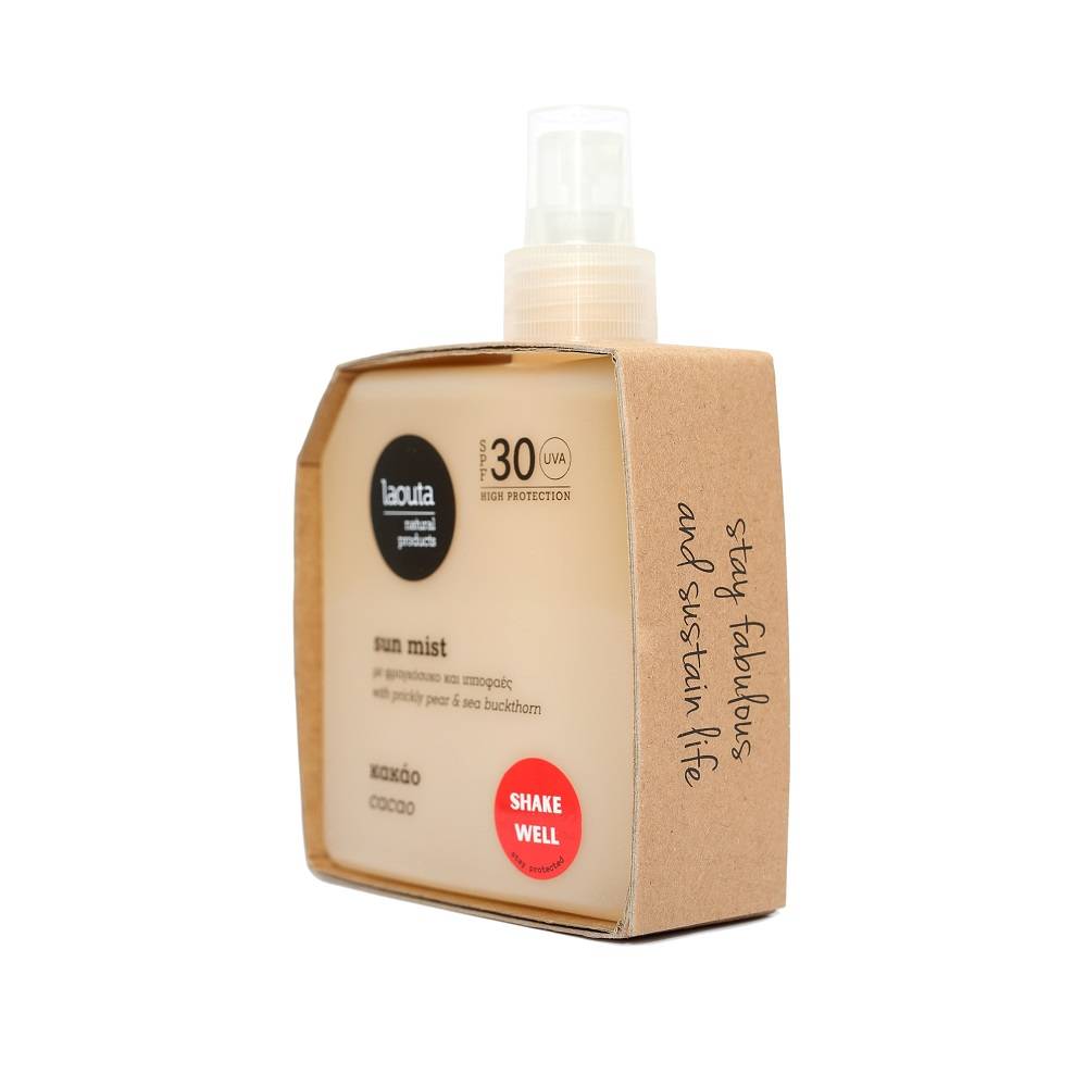 This SPF 30 sunscreen mist for face and body is packed with nourishing oils, glitter grains, and a delicious cacao scent that evokes Greek summer. Made with prickly pear, sea buckthorn, aloe, and panthenol to hydrate, protect, and soothe the skin. Housed in a non-aerosol, sugarcane-derived eco bottle. 71% natural, handmade in Greece, and completely free of parabens.