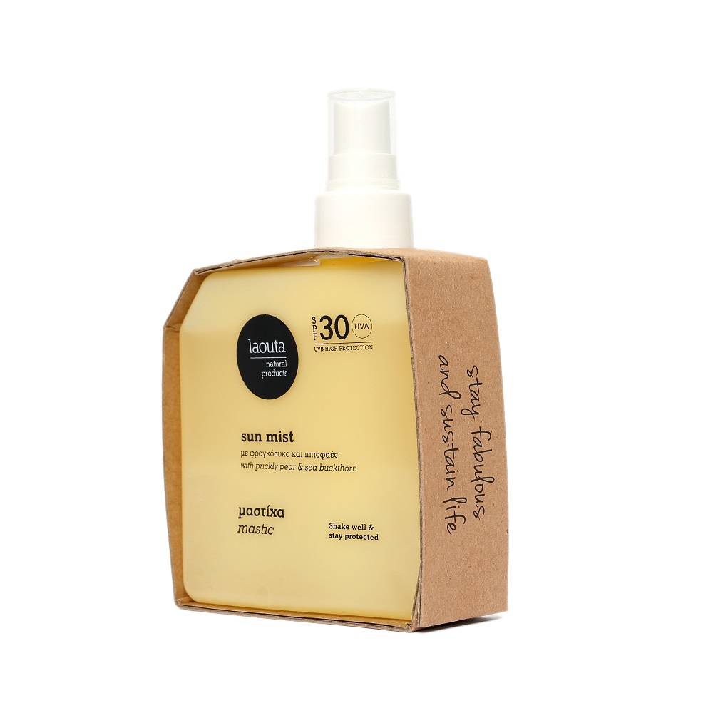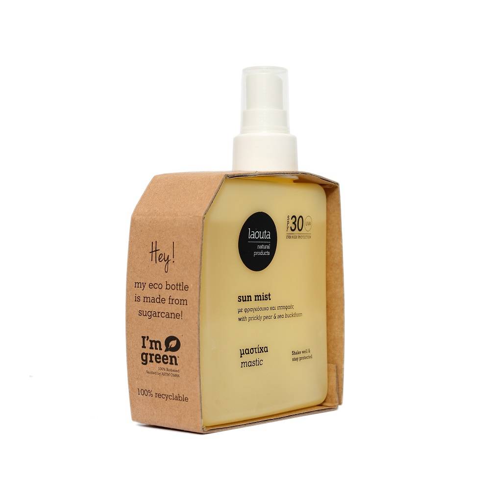 A high-protection, non-aerosol SPF 30 mist for face and body, handmade in Greece with 71% natural ingredients. Infused with prickly pear, sea buckthorn, aloe, and panthenol, it nourishes, cools, and defends skin against sun damage. Lightly scented with mastic and vanilla—it smells like Greek summer. Packaged in an eco-friendly sugarcane bottle.