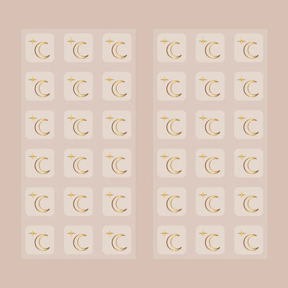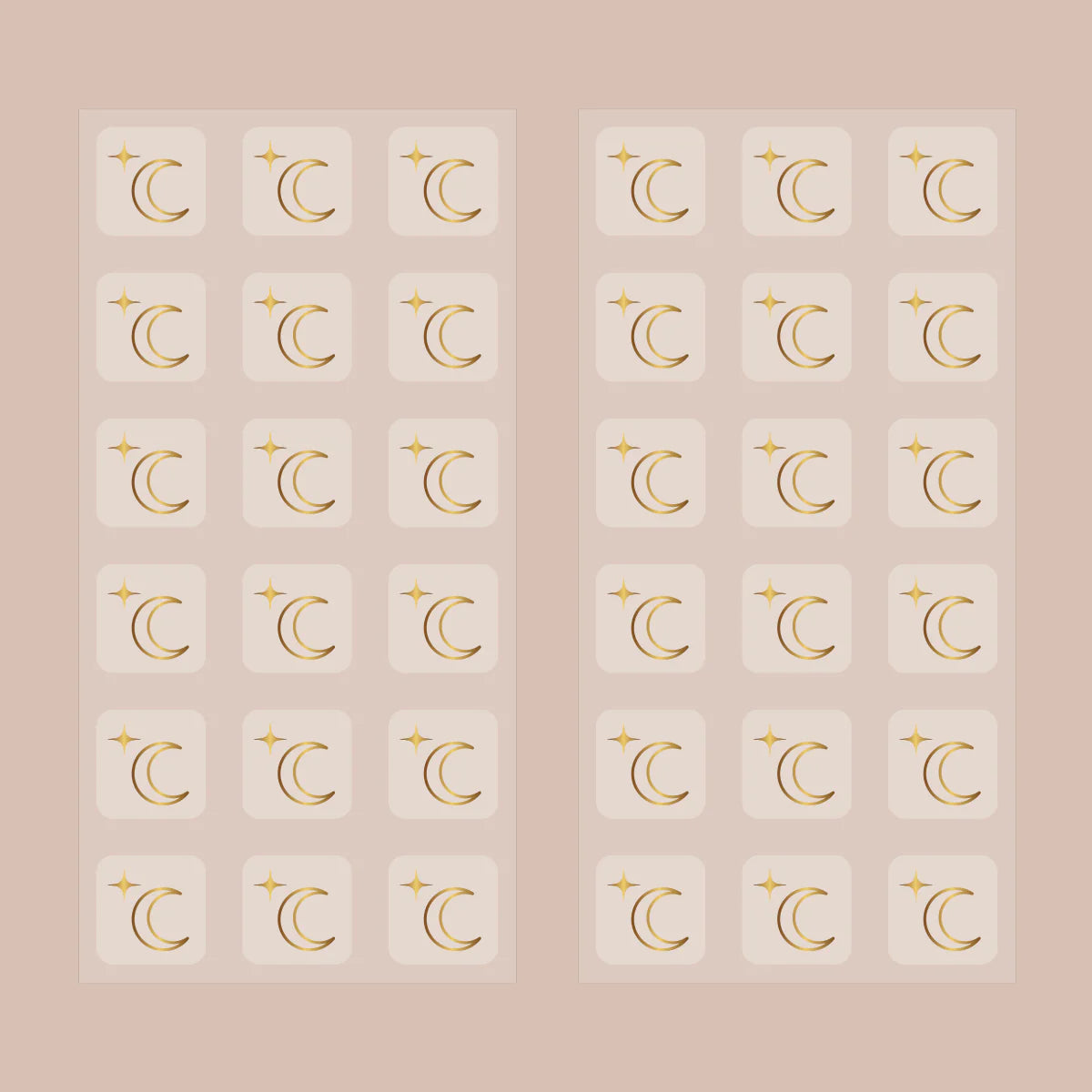 - Patch cover: ~½" diameter printed with gold moon and star motif on clear recycled PET backing, non-visible when worn