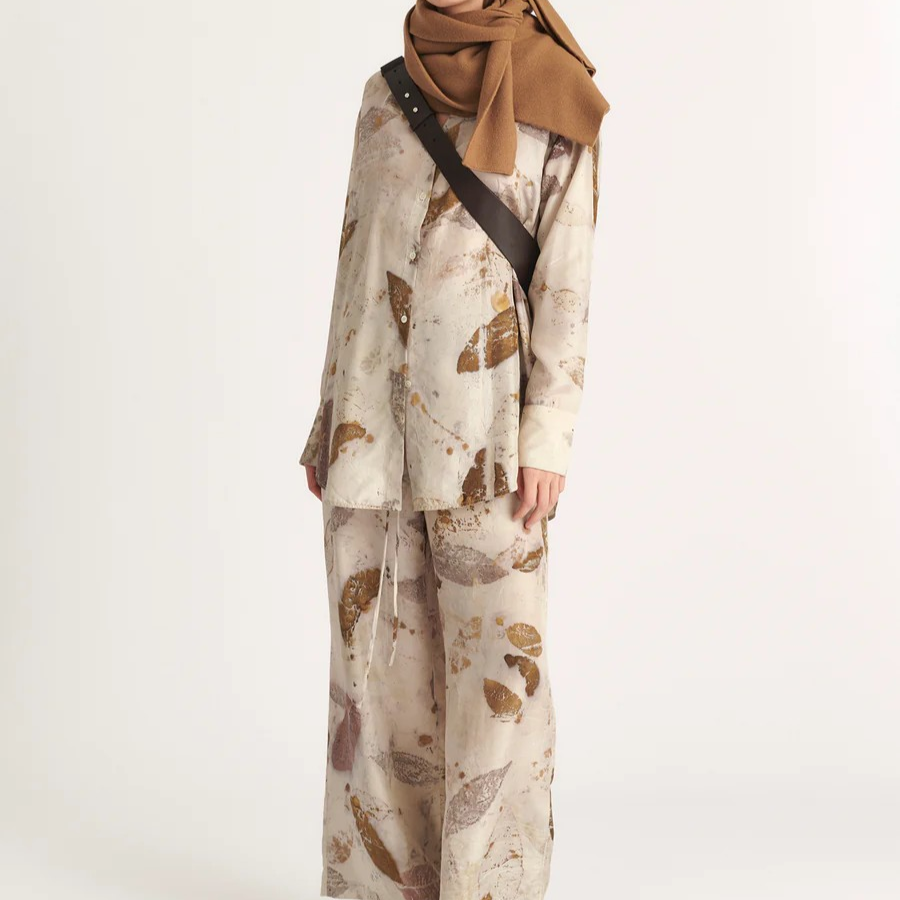 Mii Collection's Sablon Pant is made from Habotai silk and printed with the ecoprint technique, which involves applying a plant (in this case leaves) to the fabric to harvest the dye print. The Sablon Pant can be worn with the Mirabelle Shirt in the same colour to complete the look.