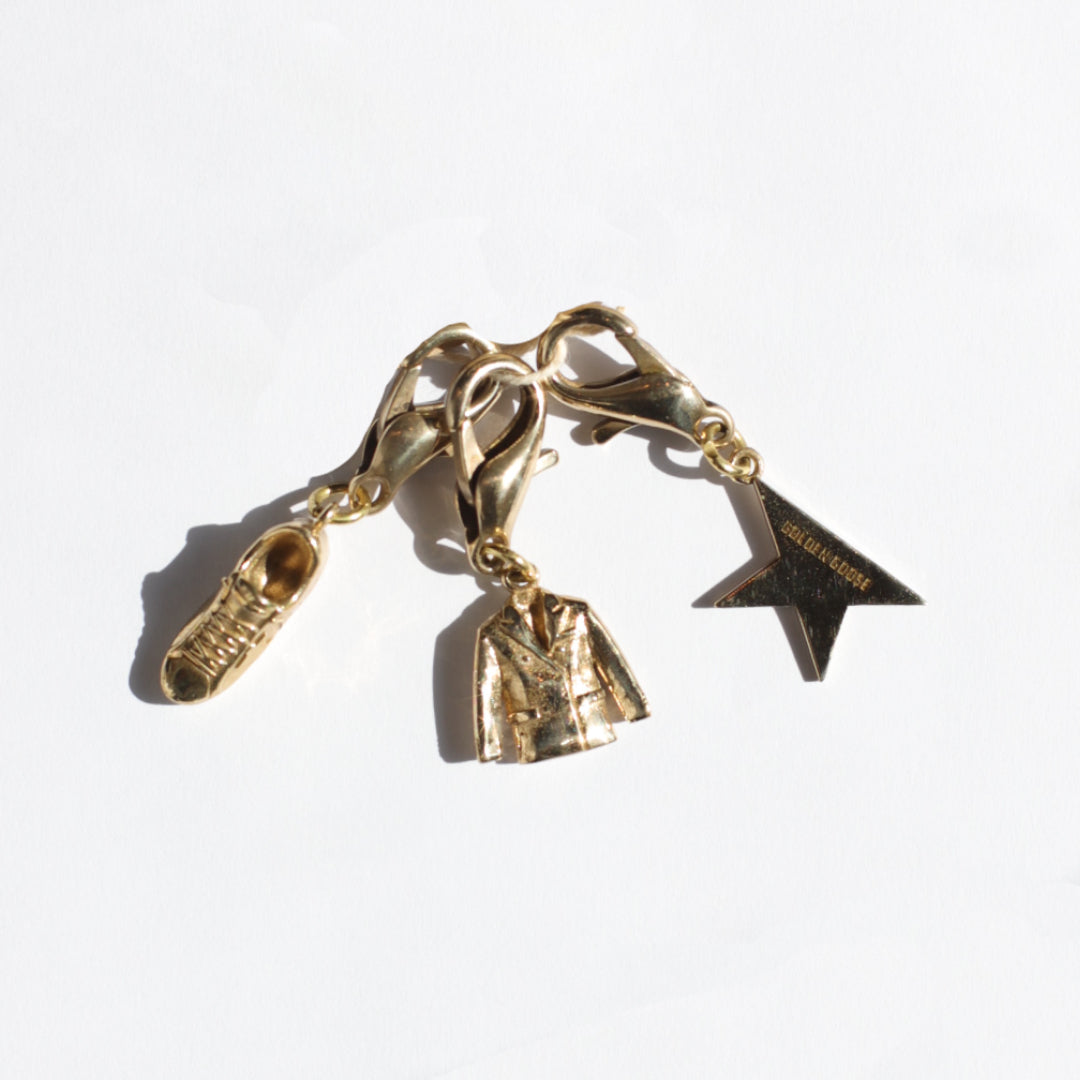 Introducing The Icon Set - a set of 3 golden brass charms by Golden Goose. Includes a star, sneaker, and a coat. it has a lobster clasp, perfect for accessorizing any bag.