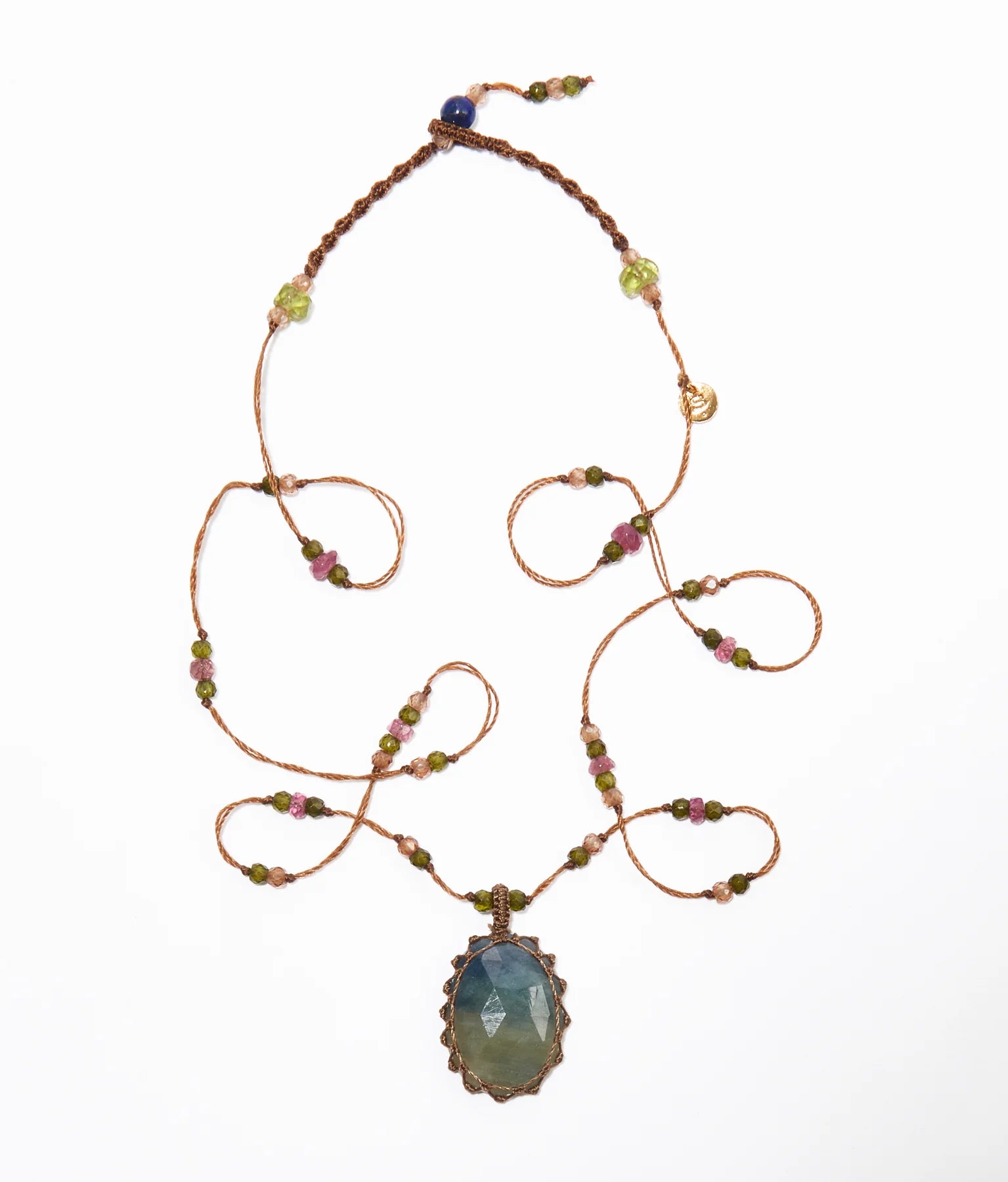 A Green Corundum Pendant that's faceted and mounted on a durable wire, accompanied by emerald beads and zirconium.