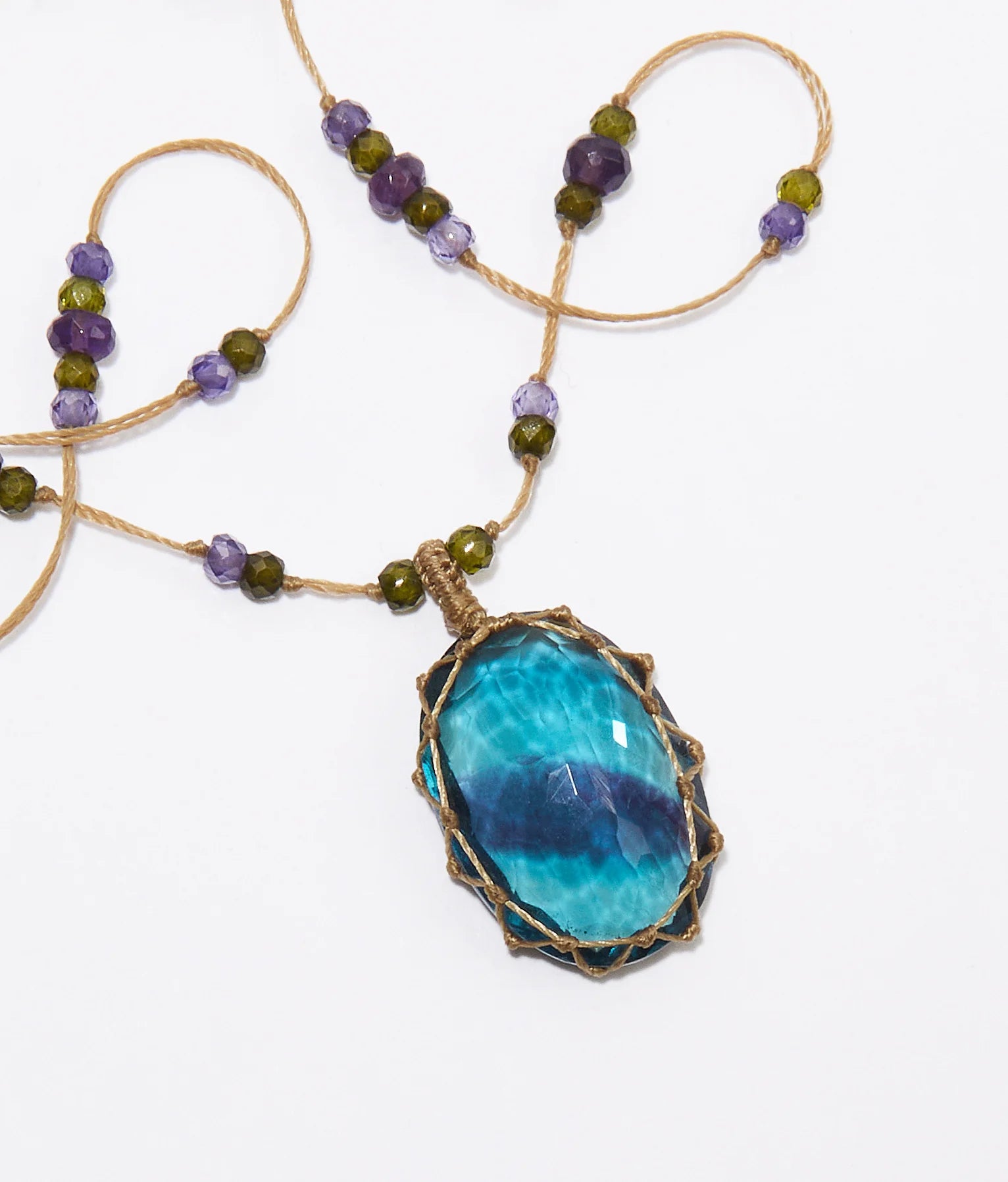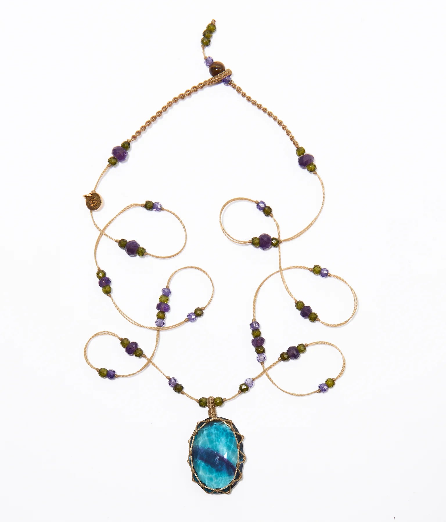 This Tibetan Short Necklace boasts a Rainbow Fluorite Pendant that hangs from a strong wire. Accompanied by stunning amethyst beads and sparkling zirconium, this necklace adds a touch of whimsy to any outfit.