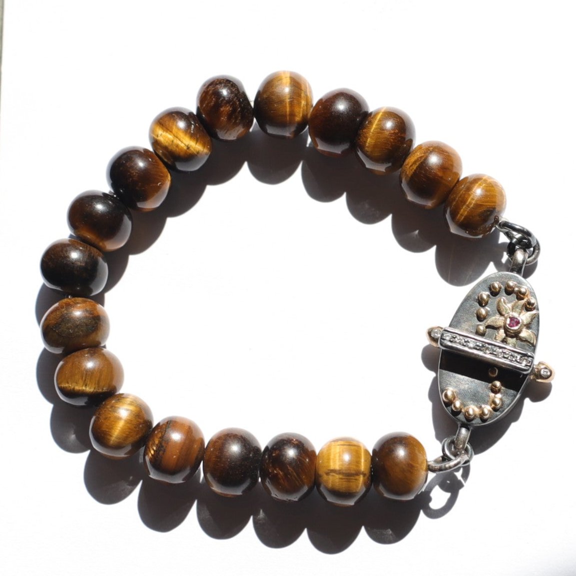 This tiger eye bead bracelet features a stunning sun and moon detail set on a sleek silver bar.