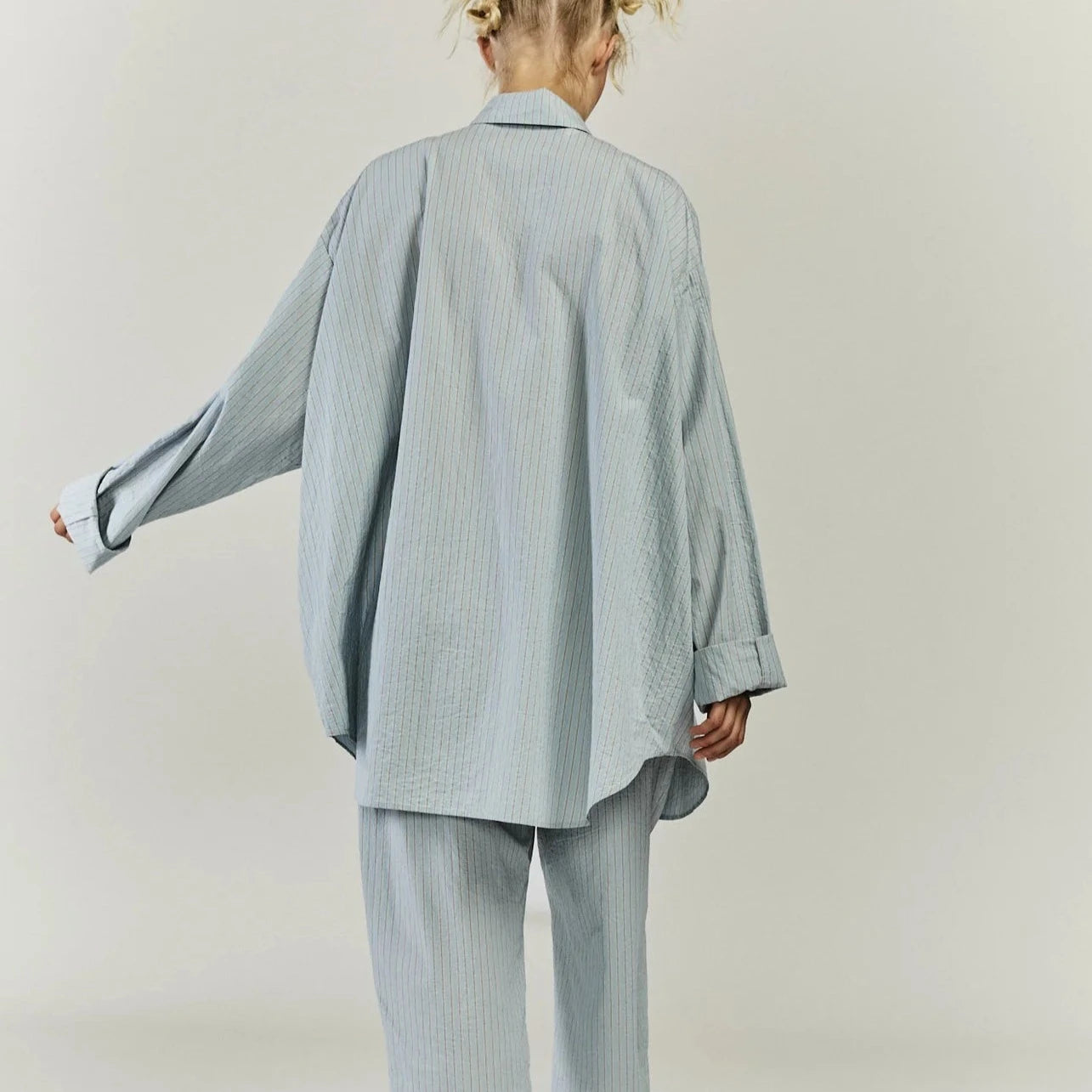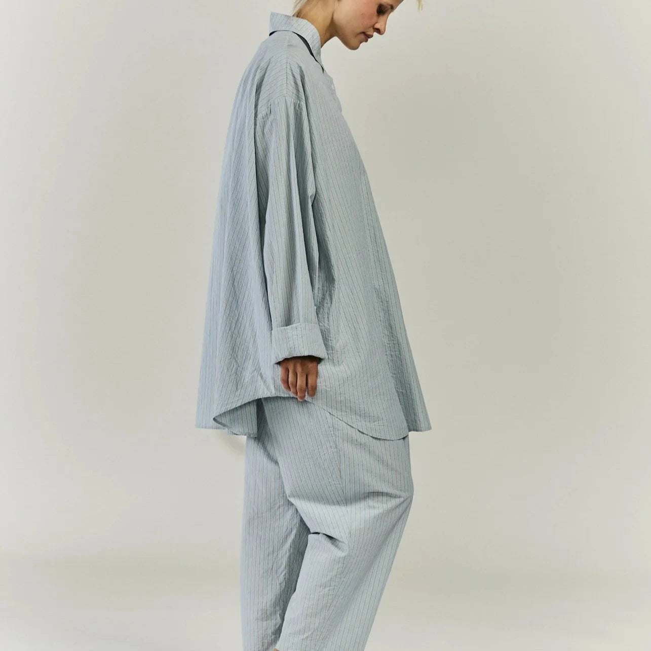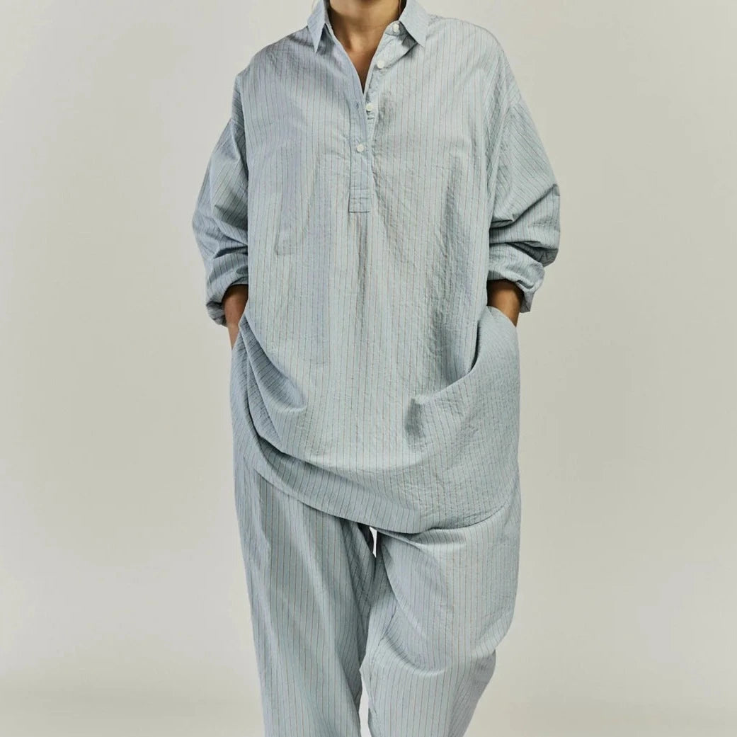 Casey Casey's Tippy Top in Blue Stripe is a relaxed and oversized half button shirt made from lightweight paper cotton with a curved and contoured hemline. Made in Bulgaria.