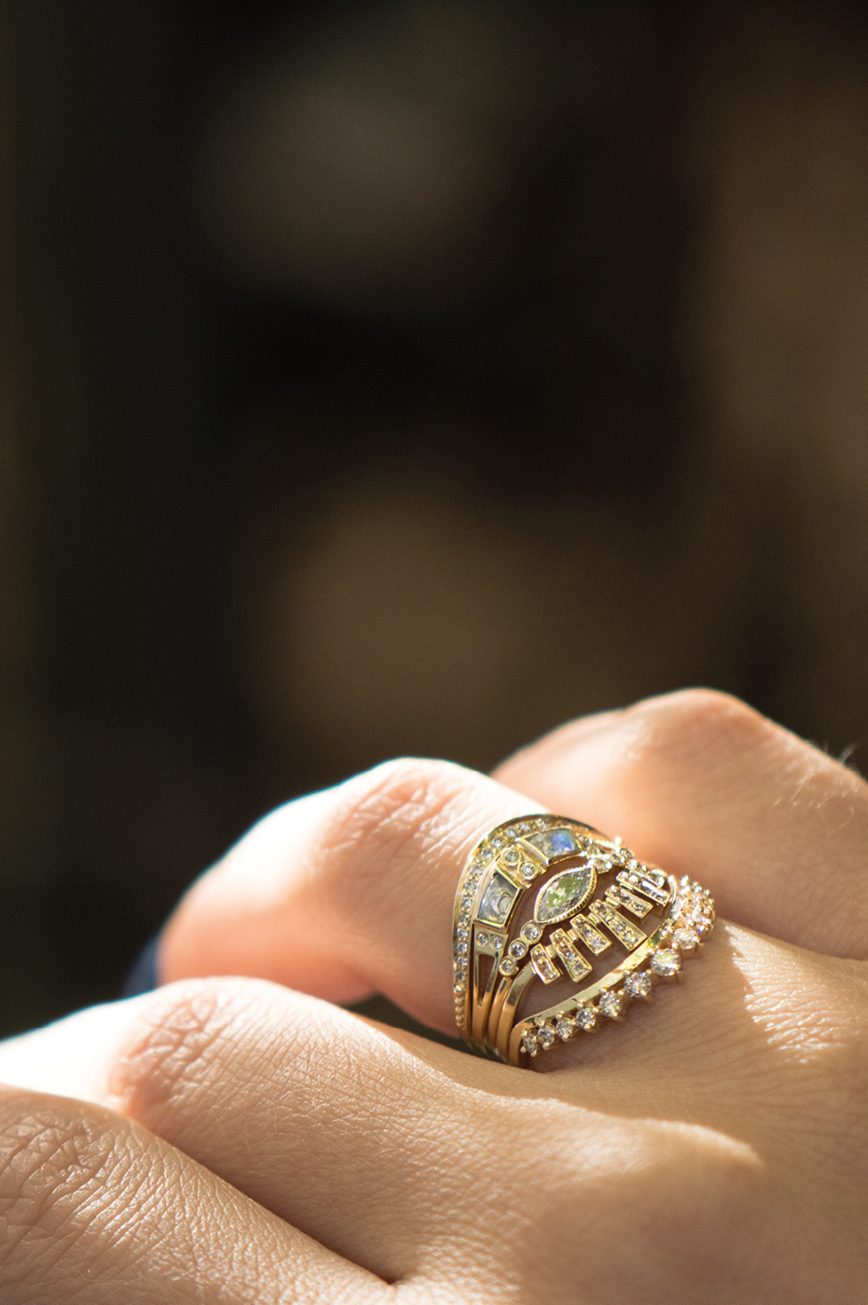 Celine Daoust 14k Light Yellow Gold Totem Ring With Two Moonstones and Six Diamonds. The Stones Come in a Gradient of Light Iridescent Tones.