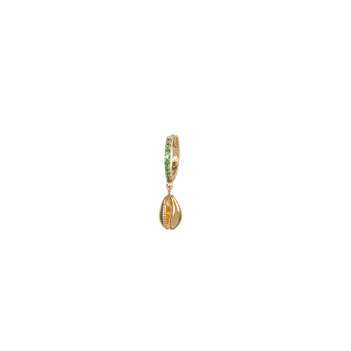 The And Paris Créole Tsavorites & Cauri is a single 18 K yellow-gold demi-hoop, elegantly half‑pavé set with vivid green tsavorite garnets and finished with a charming cowrie shell charm.